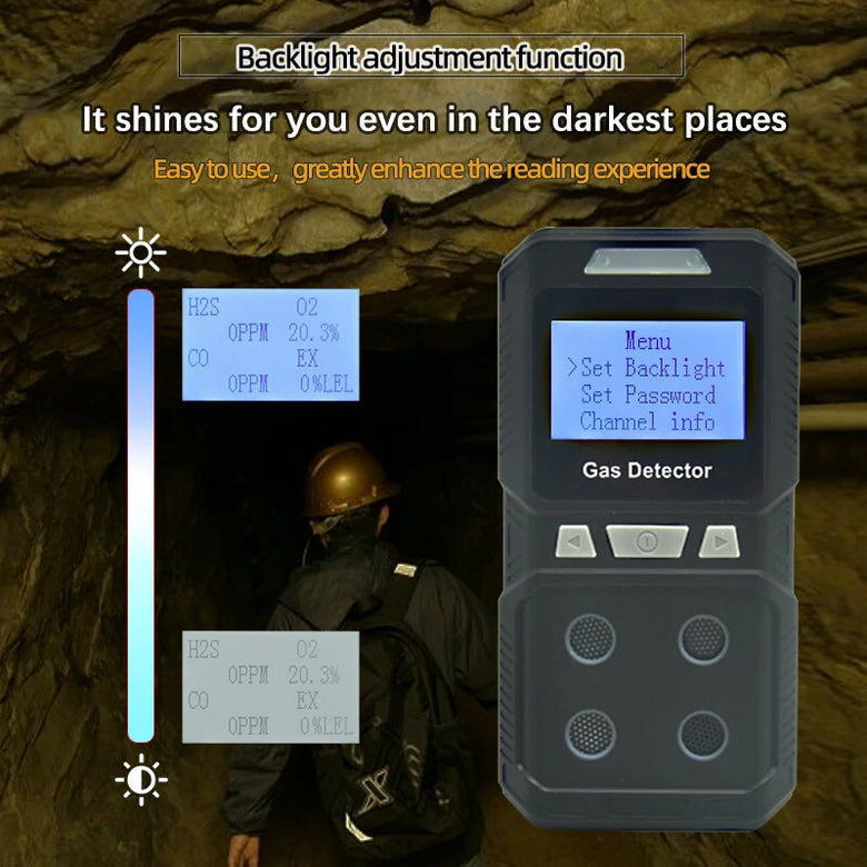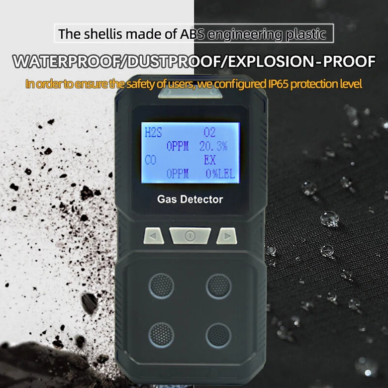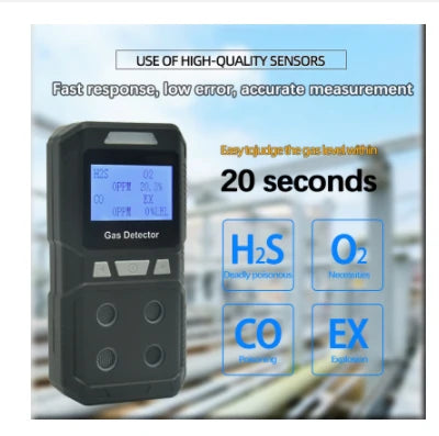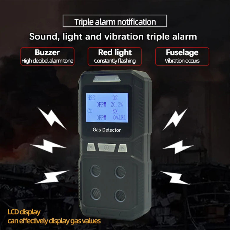 • Multi-Gas Detector Alarm Light Portable Gas Detector with H2S O2 CO and Combustible Gas Detection Audible Visual Vibration Alerts High Precision Rechargeable Battery Suitable for Industrial Applications