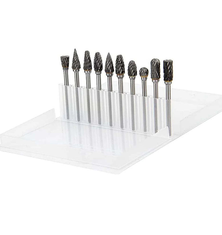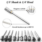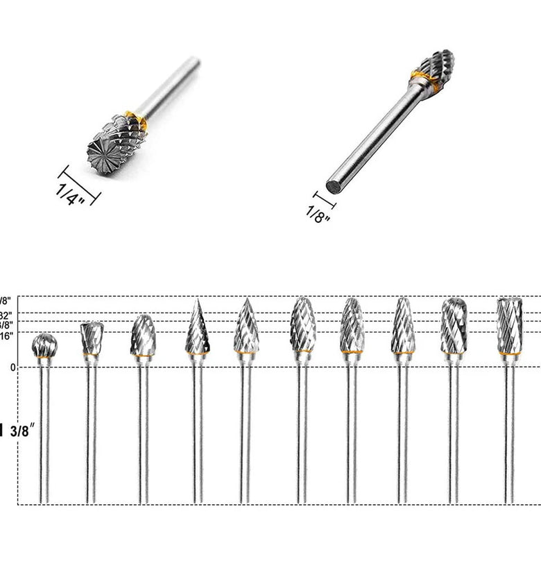 Material: This carbide burr set/rotary bit set is made of premium tungsten Carbide steel which has long working life, Shank diameter: 3 mm(1/8 inch), Cutting edge diameter: 6 mm(1/4 inch), Please check the size before you buy it.