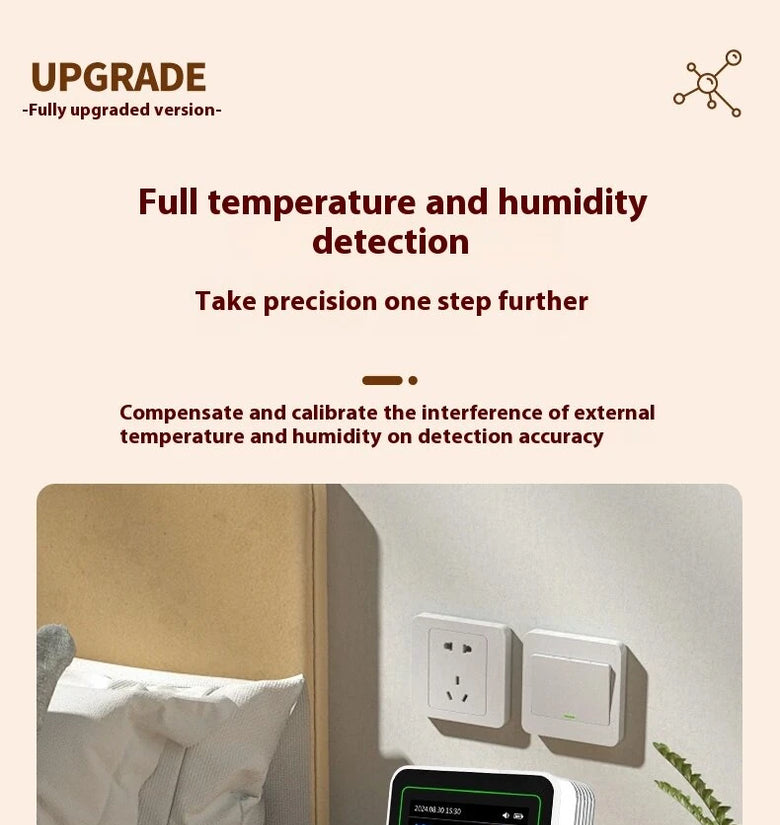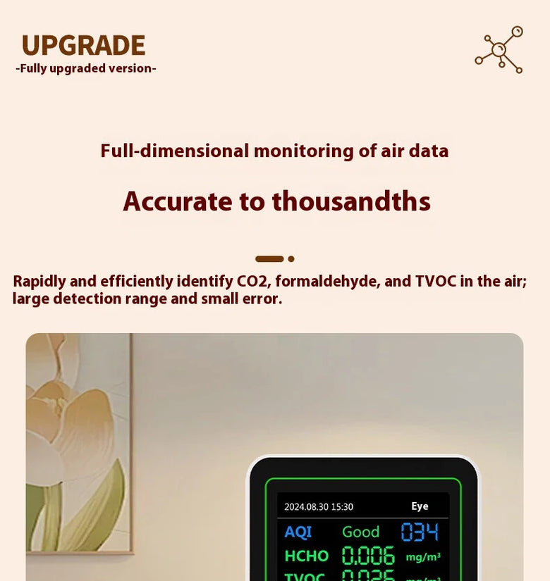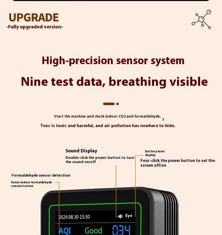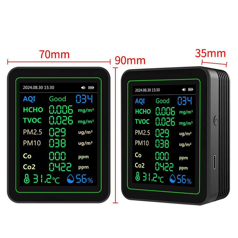 This device combines 9 critical real-time measurements (HCHO, TVOC, PM2.5, PM10, CO, CO2, temperature, humidity, AQI) with 3 functional indicators, providing unmatched detail for comprehensive air quality monitoring.