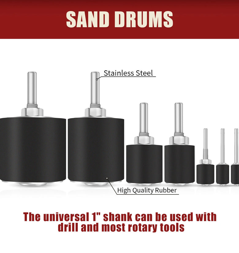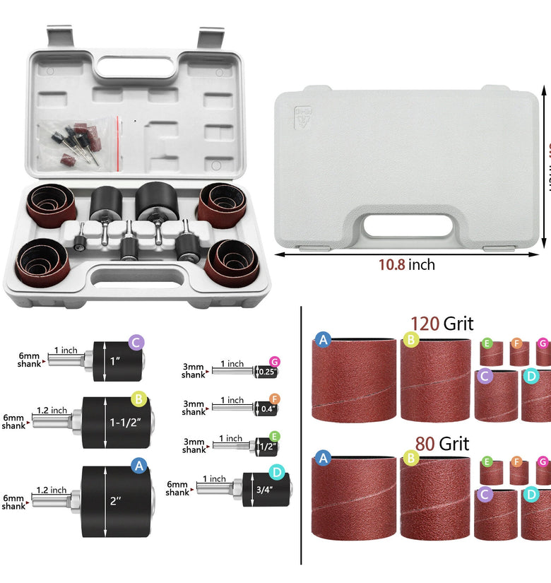- Includes: Various abrasive sleeves, sanding drum mandrels