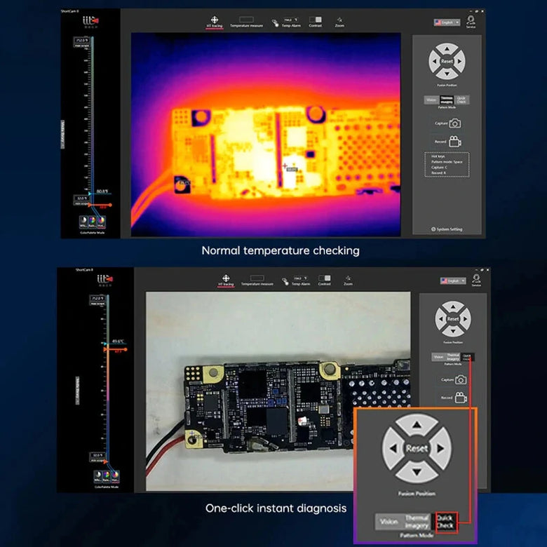 Practical Tools: This device provides application functions such as high and low-temperature tracking, partial amplification, comparative analysis, capture, and video recording. These features allow for fast and precise troubleshooting of PCB faults.
