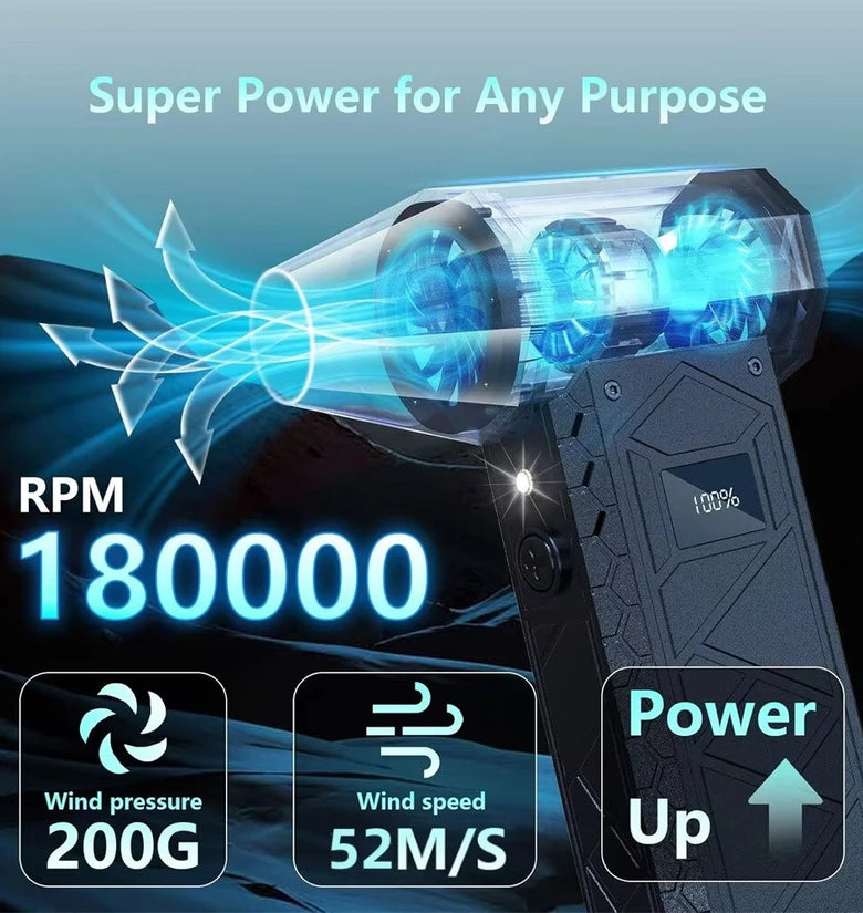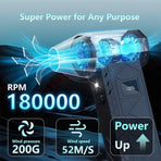 With a turbo peak speed of 180,000 RPM, this air blower offers an impressive wind speed of up to 52m/s, making it highly effective for clearing dust, soot, and debris efficiently.
