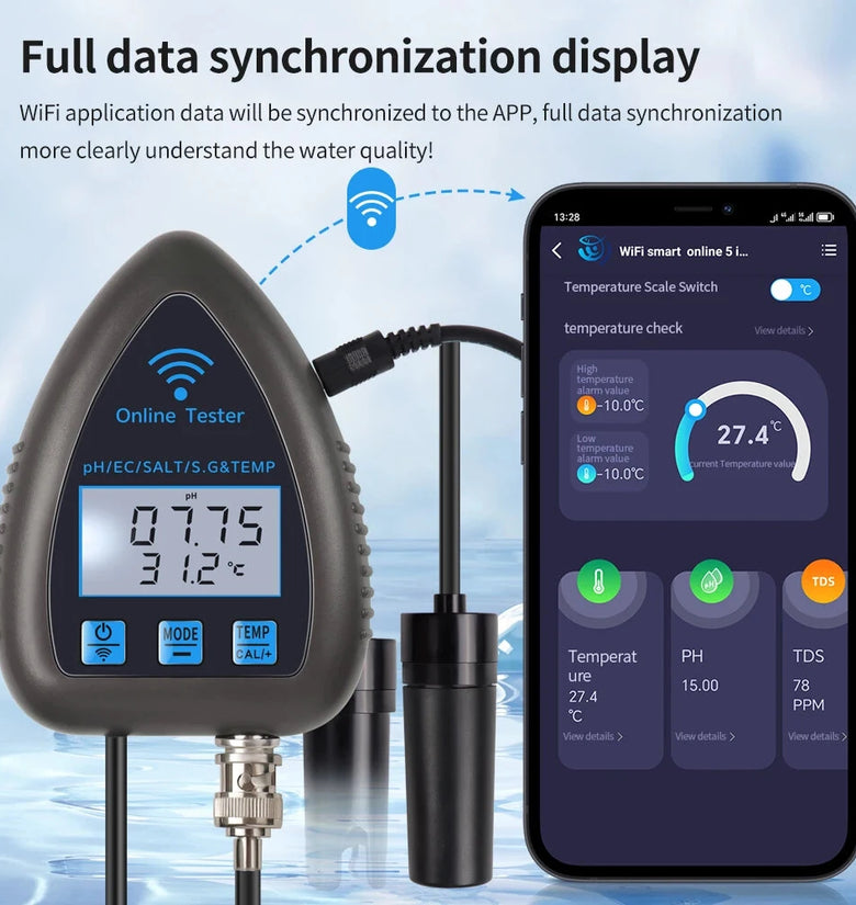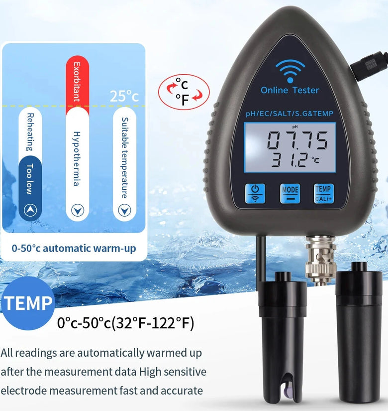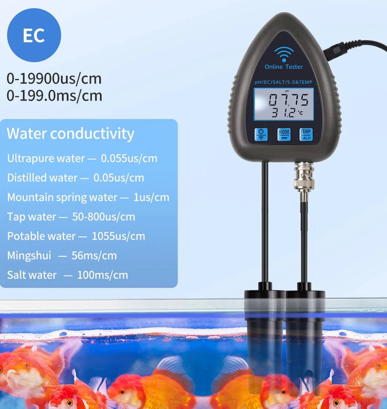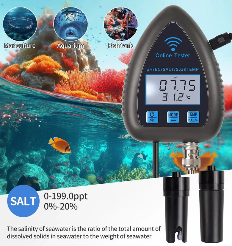 1.Comprehensive 5-in-1 Measurements: Effectively monitors PH, EC, SALT, S.G, and temperature in a variety of water environments, ensuring full versatility.