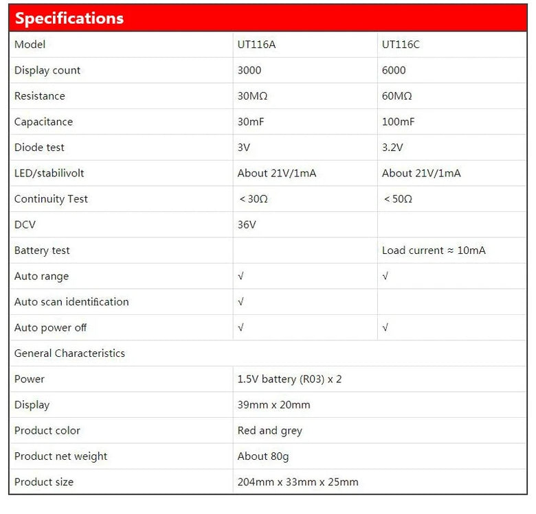 mso-bidi-font-family:'Times New Roman';font-size:10.5000pt;mso-font-kerning:1.0000pt;'>Enhanced Display Counts and User Interface: The UT116A model features a 3000-count display, providing greater precision and readability. This model come with a clear LCD screen that displays measurement results accurately, supporting efficient data interpretation for complex testing tasks.mso-bidi-font-family:'Times New Roman';font-size:10.5000pt;mso-font-kerning:1.0000pt;'>