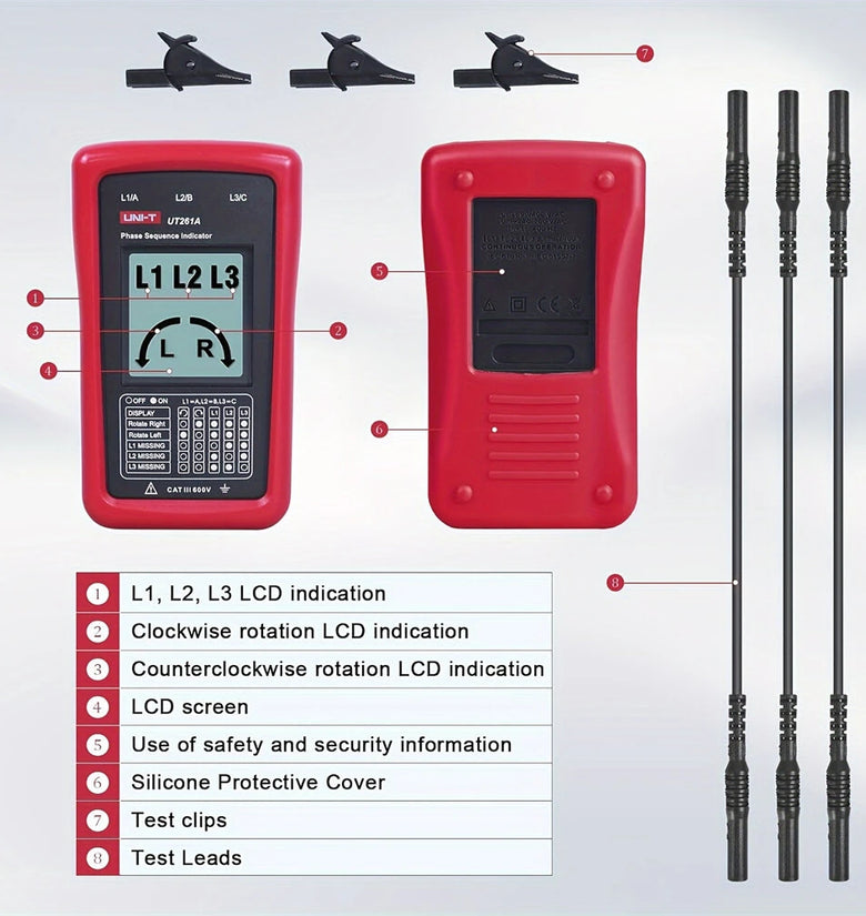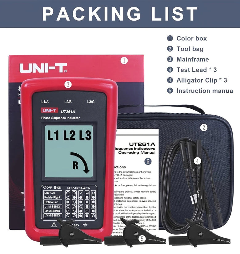 • UNI-T UT261A 3 Phase Sequence Tester AC Phase Rotation Meter Voltage Range 40V- 690V LCD Display IEC Safety Standard CAT III 600V Electrical Testing Tool