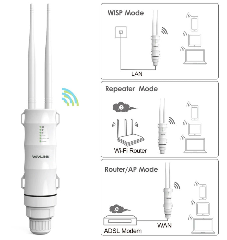 The AC600 HighPower Wi-Fi AP/Repeater is mainly used for providing free Wi-Fi service in big area such as factory, community, street or etc. The AP/Repeater can take an existing 2.4GHz or 5GHz wireless signal, repeat and extend it to a longer range where it is too far away for the router or access point to reach. The AP/Repeater simultaneously supports 2.4G and 5G wireless network connection, and it can supports 2.4G and 5G transmission speeds of up to 600Mbps. It has 2 x External Antennas providing even better wireless performance, transmission rates, stability technology automatically avoids channel conflicts using its channel selection feature.
