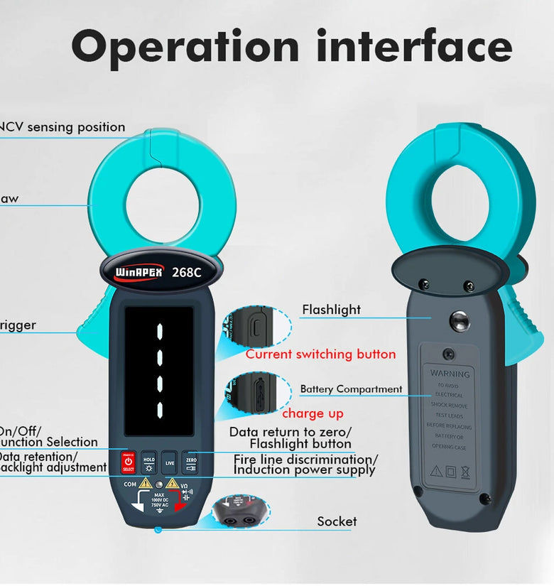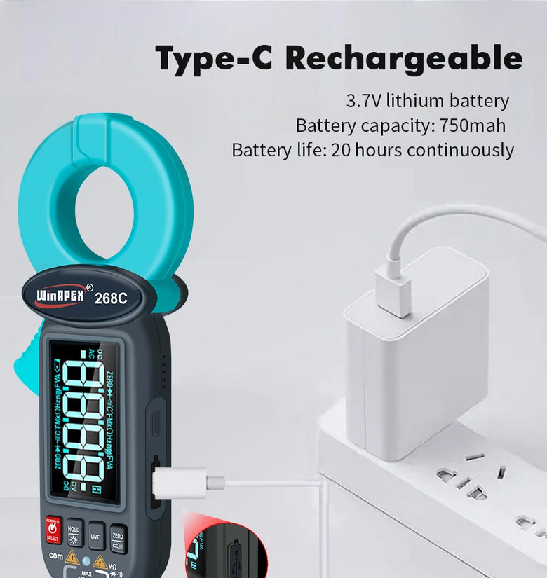 • WinAPEX 268C Leakge Current Tester Clamp Meter AC 60mA-100A 0.01mA Resolution High Precision Leakage Type-C Rechargeable Digital Multimeter Electrical Tester Backlit LCD Display