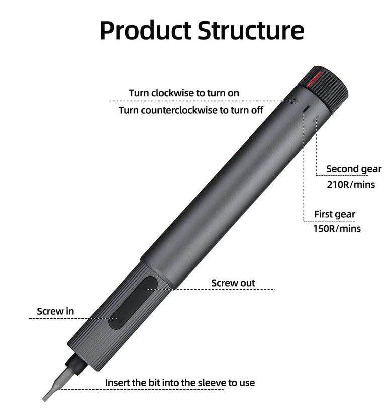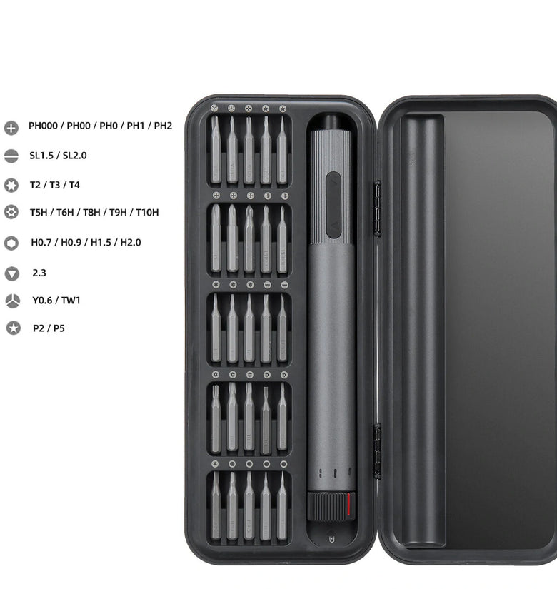This E2 Precision Electric Screwdriver Set is compact and lightweight, measuring just 194×80×28mm and weighing only 331g, making it easy to handle and ideal for any household task.It comes with a rechargeable 650mAh battery and a convenient charging time of just 60 minutes, so you're always ready to take on any home improvement task.The screwdriver set features adaptable dual-speed adjustment capability, offering a low speed of 150r/min and a high speed of 210r/min, providing power and precision in every task.The perfect combination of electric and manual use provides an integrated hand tool, offering easy control and the ability to tackle a variety of home projects.This versatile tool set includes 25 distinct screwdriver heads spanning 10 categories, making it suited to 95% of common household tasks, ensuring you have the right tool for each job.Specifications:Brand: XIAOMI AtuMan DUKAInput: 5V 1AMaximum Torque: 3N.mRated Voltage: 3.7VBattery Capacity: 650mAhTorque: Electric 0.2N·m/Manual 3N·mHigh Gear Speed: 210r/minLow Gear Speed: 150r/minCharging Time: 60minProduct Size: 194×80×28mmProduct Weight: 331gScrewdriver Heads Type:P2/P5/W1.5/Y0.5/TW1/PH000/PH00/PH0/PH1/PH2/SL1.5/SL2.0/T2/T3/T4/T5H/T6H/T8H/T9H/T10H/H0.7/H0.9/H1.5/H2.0/2.3Package Included:1 x E2 Precision Electric Screwdriver25 x Screwdriver Heads1 x Rechargeable Battery1 x Charger1 x Carry Case Detail Pictures: