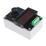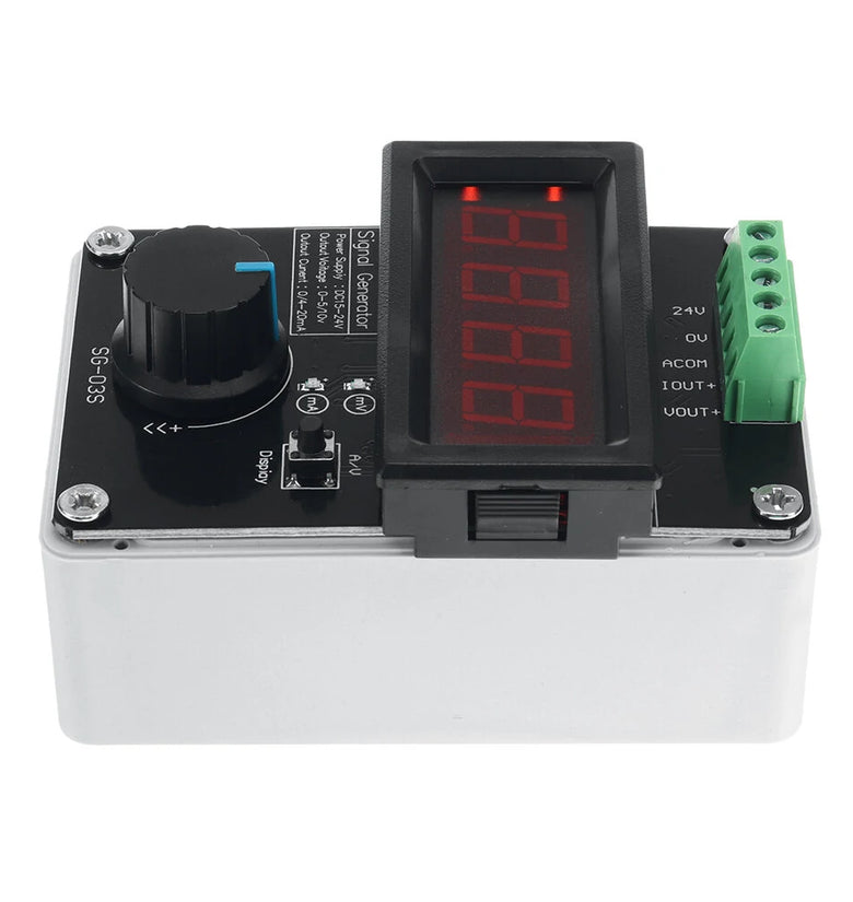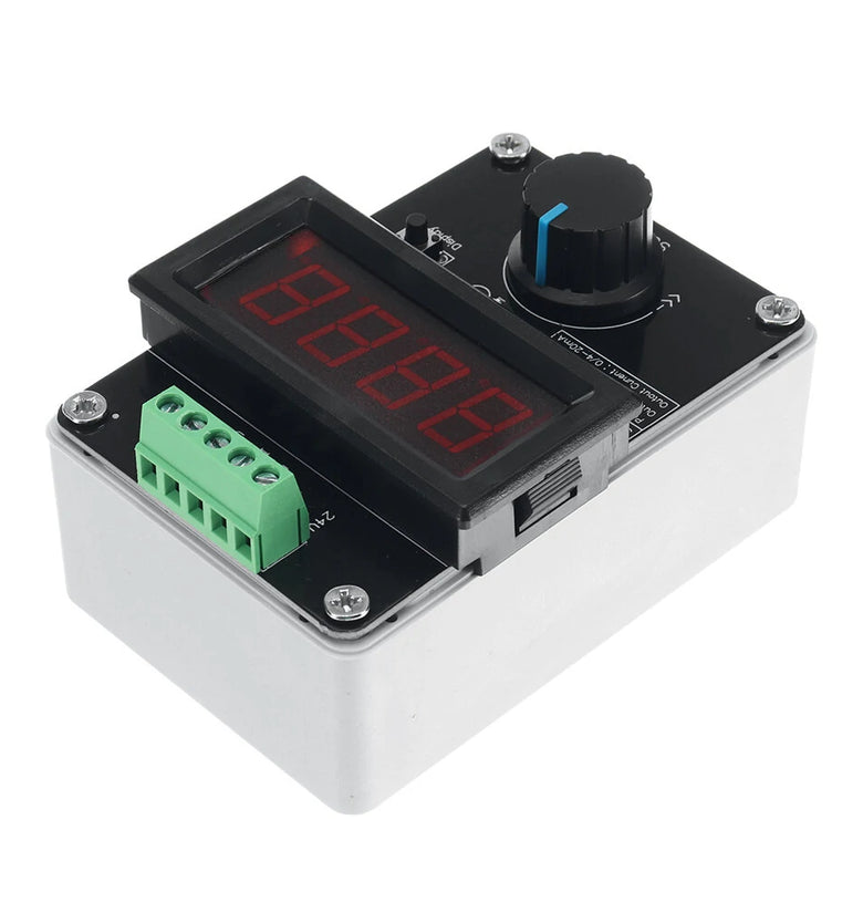Supply voltage: 24VDCVoltage output: 0-10V adjustable, drive current <20mACurrent output: 0-22mA adjustable, load sampling resistance <500 ohmsAdjustment resolution: 0.1V/0.01V or 0.1mA/0.01mALinearity: better than 0.2%Display mode: 4-digit digital tubeAdjustment method: rotary encoder + keyTerminal interface definition:24v: positive pole of power supply0V: negative pole of power supplyACOM: voltage and current signal output negative poleAout+: Current signal output positive poleVout+: voltage signal output positive poleParameter settings and usage1. Switch voltage/current mode: Click the Display button to switch the current voltage/current mode, the current output value is digitally displayed, rotate the encoder to change the output value, press the encoder to reset and restore the output value;2. How to enter the menu mode: long press the rotary encoder, the screen will display ----, at this time the rotary encoder rotates once each time; in voltage mode, the order is right, left, left, left, and right, the screen will display rLLr, if the password is correct, the menu interface will be automatically entered. P001; In current mode, the order is right, left, left, and the screen displays rLrL. If the password is correct, the menu interface will automatically enter and P001 will be displayed;3. Save and exit: When the 'POOX' interface is currently displayed, long pressing the encoder will save and exit to the main interface;4. Exit without saving: When the 'POOX' interface is currently displayed, enter the parameter adjustment mode and long press the encoder to exit to the main interface without saving;