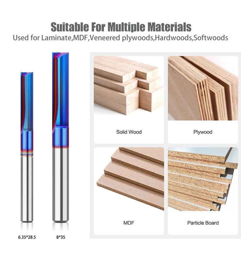 • 1/4inch/ 6.35mm 8mm Shank 2-Flute Tungsten Carbide Straight Router Bit with Nano Blue Coating for CNC Router MDF Woodworking