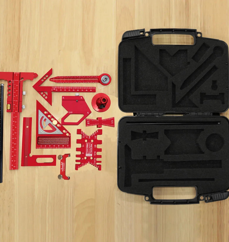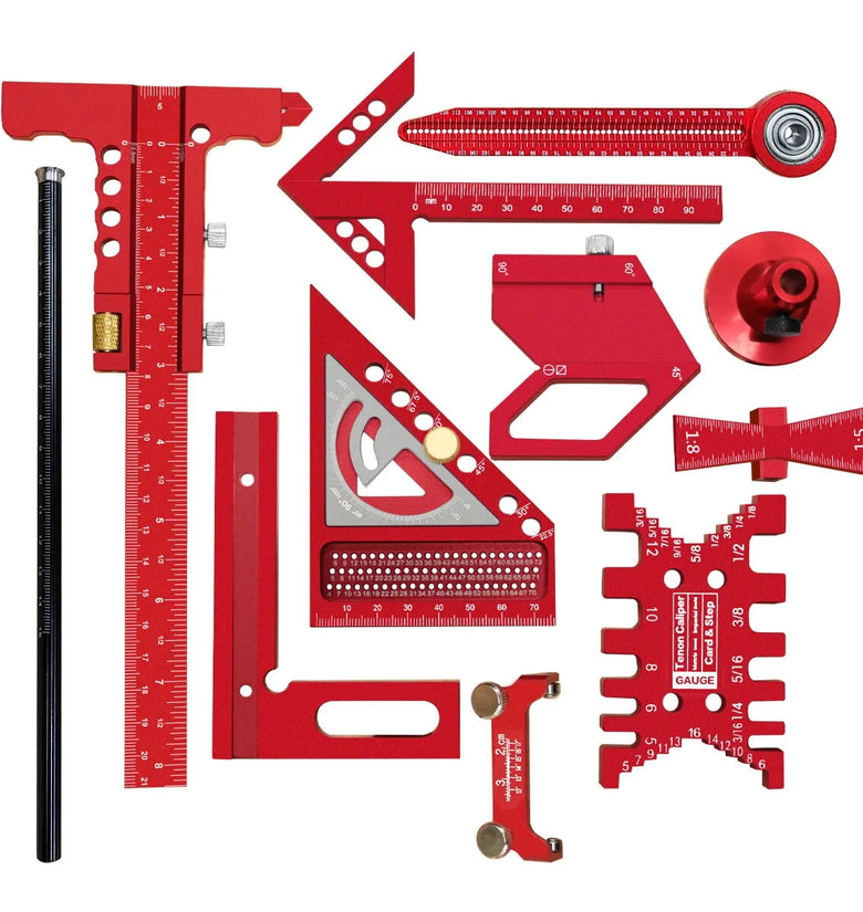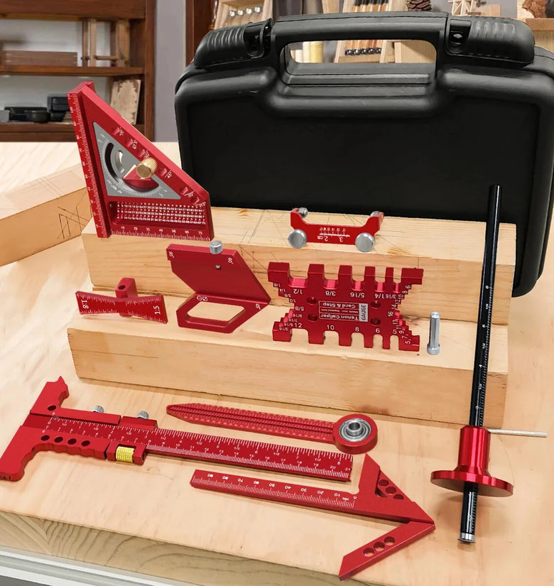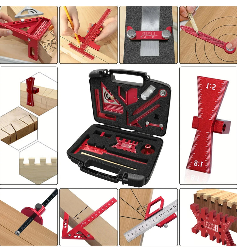 Includes specialized rulers and gauges, such as a triangle combination ruler, dovetail marker, and T-shaped ruler, tailored for a wide range of woodworking precision tasks like layout and splicing.