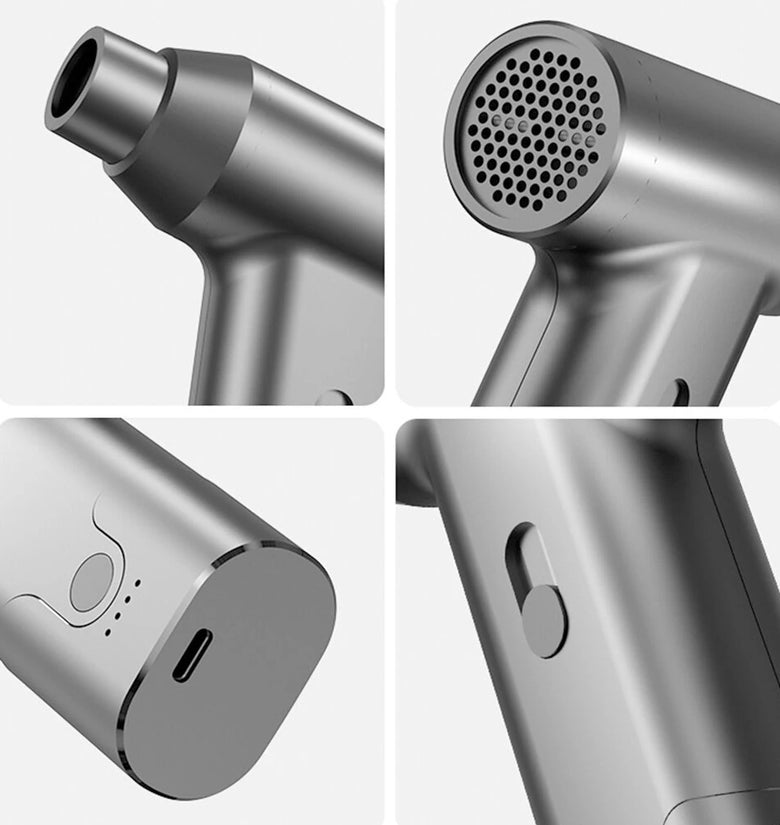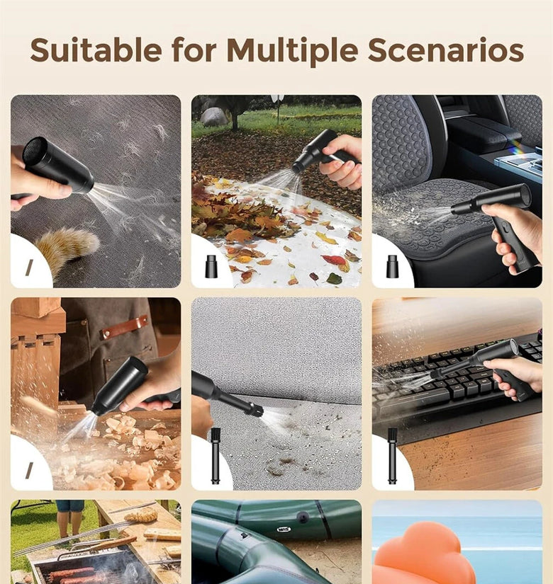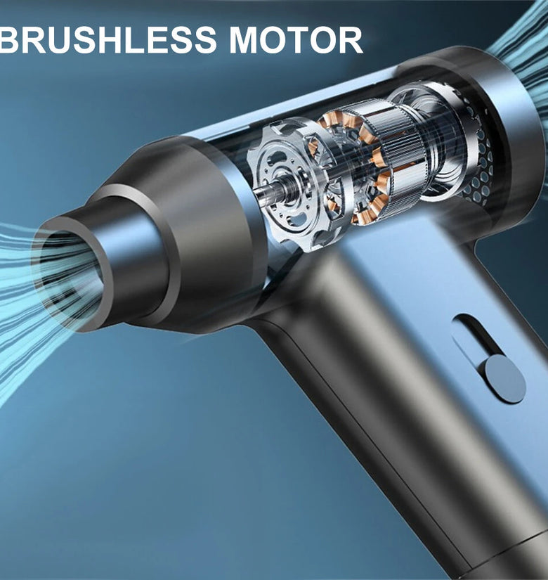 Powerful Turbo Air Dust Collector: The compressed air duster delivers a high-performance cleaning experience with a maximum speed of 110000 RPM and stepless speed control. Designed to efficiently remove dirt from various crevices in keyboards and electronic devices, it offers versatile usage for home, office, and car cleaning. Its exceptional dust removal capability makes it an indispensable cleaning tool.Advanced Brushless Motor: Equipped with a brushless motor, this electric duster ensures a longer service life and stable performance. The motor generates a robust blowing force of 3.17 oz, enabling effective dust removal at speeds up to 110000 RPM. This powerful motor enhances the cleaning efficiency, providing a superior dusting experience compared to traditional models.Eco-Friendly Alternative to Compressed Air: This cordless air duster provides a sustainable and economical alternative to canned air. Rechargeable and reusable, it eliminates the need for disposable air canisters, thus reducing waste. With no liquid or ice formation during cleaning, it safeguards your electronic devices. The included C-type data cable allows for quick recharging in just 2.5 hours. The adjustable wind speed caters to various cleaning needs.Portable and Compact Design: Designed for portability, this mini air duster is lightweight and compact, measuring 4.1 inches by 1.4 inches by 5.5 inches and weighing only 225 grams. Its palm-sized form factor allows it to be easily stowed in pockets, drawers, or car compartments, providing on-the-go dust and debris removal whenever you need it.Versatile Cleaning Kit: The mini blower comes with three interchangeable nozzles, making it suitable for a wide range of applications. It effectively cleans computer keyboards, laptops, fans, car seats, blinds, sawdust, and pet hair. Additionally, it can be used for inflating swimming rings and other inflatable objects, as well as for picnic fire-starting. This versatile tool enhances your cleaning capabilities with its multiple capabilities.Specifications:Product Name: Electric Air DusterMotor Type: Brushless MotorMaximum Speed: 110000 RPMBlowing Force: 3.17 ozRecharge Time: 2.5 hoursSize: 4.1 inches x 1.4 inches x 5.5 inchesWeight: 225gColor: Varies by modelPower Supply: Rechargeable via C-type data cable (without adapter)Package Included:1 x Electric Air Duster1 x C-type Data Cable5 x Interchangeable Nozzles1 x User ManualNotes:Please use a 5V/2A power adapter for charging.To extend battery life, recharge the blower after each use before storing.Detail Pictures: