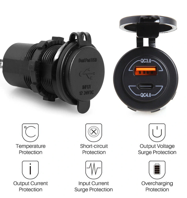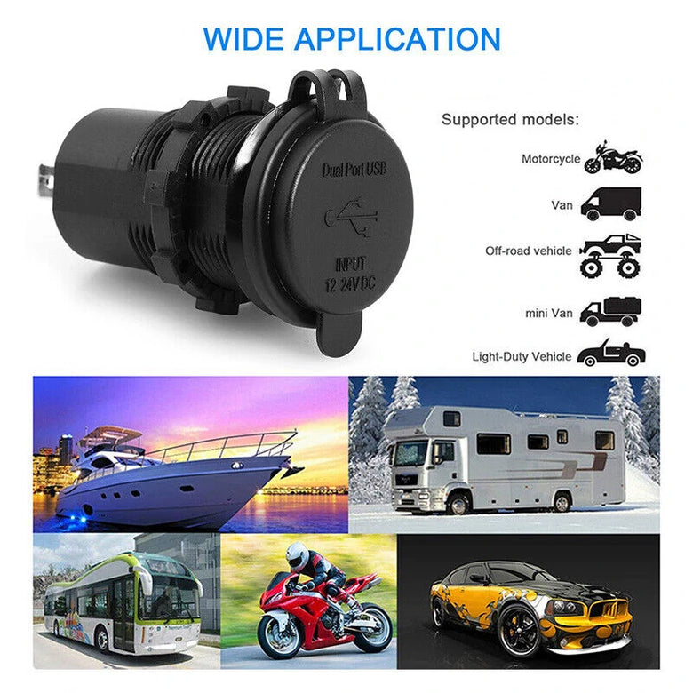 1. Brand New universal dual USB charger with waterproof cover great for your ATV/UTV/RTV, car, truck, boat, camper trailer and buses. It is suitable for charging smart phones, tablets, iPads, GPS navigators, cameras, car MP3, car vacuum cleaner, car tire inflation etc.