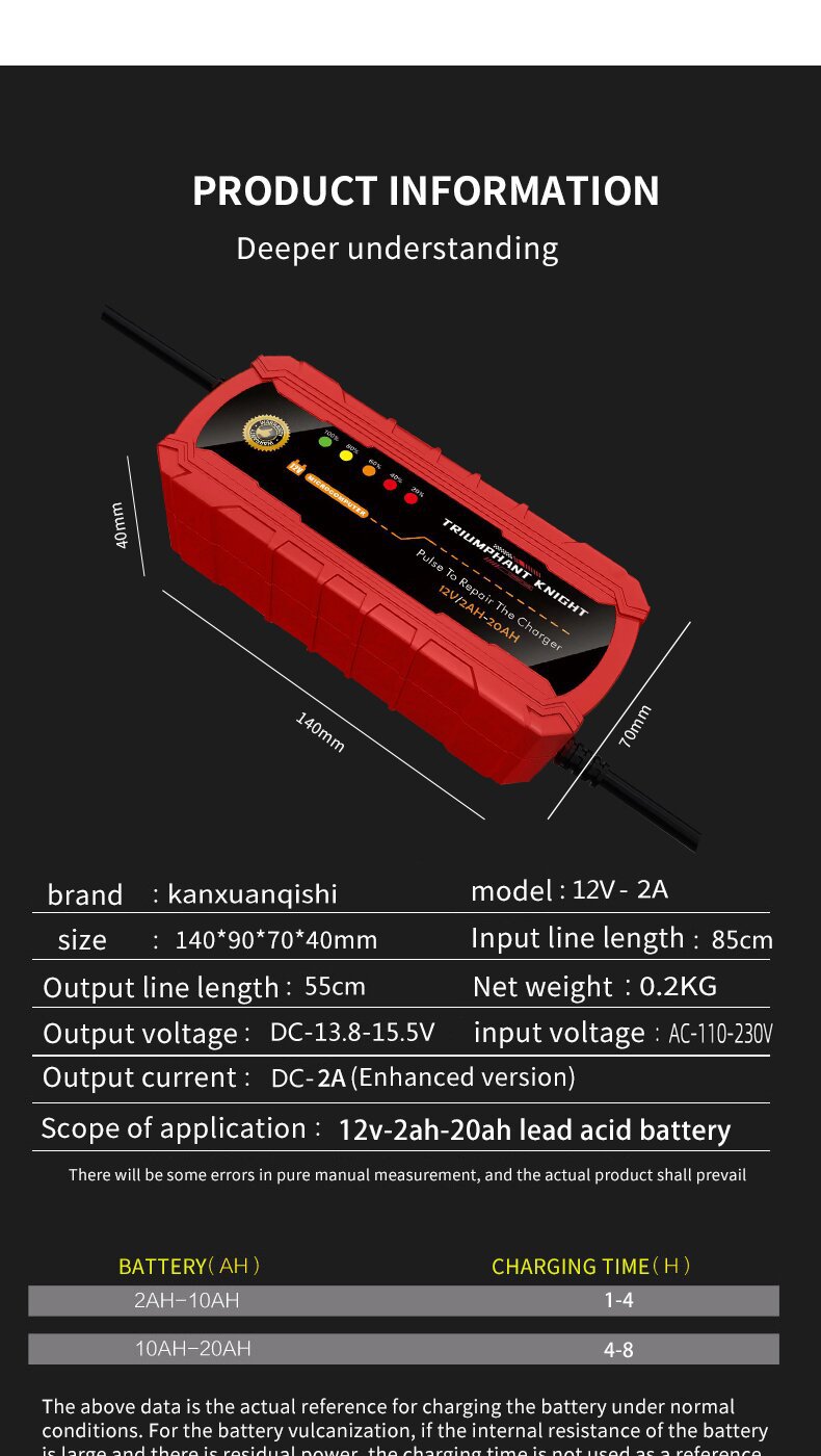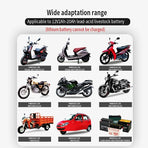 - Universal Compatibility: Designed for a wide range of vehicles, this charger supports various 12V pedal motorcycles, motorcycles, tricycles, and lead-acid livestock batteries. Not suitable for lithium batteries, ensuring targeted support for lead-acid types.