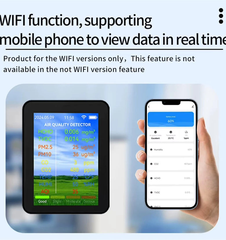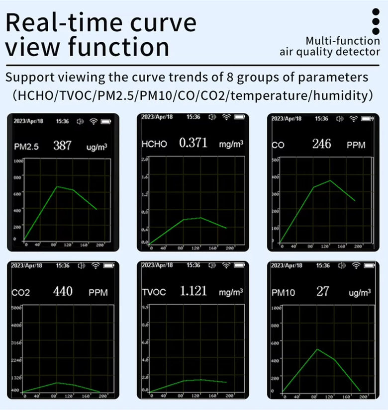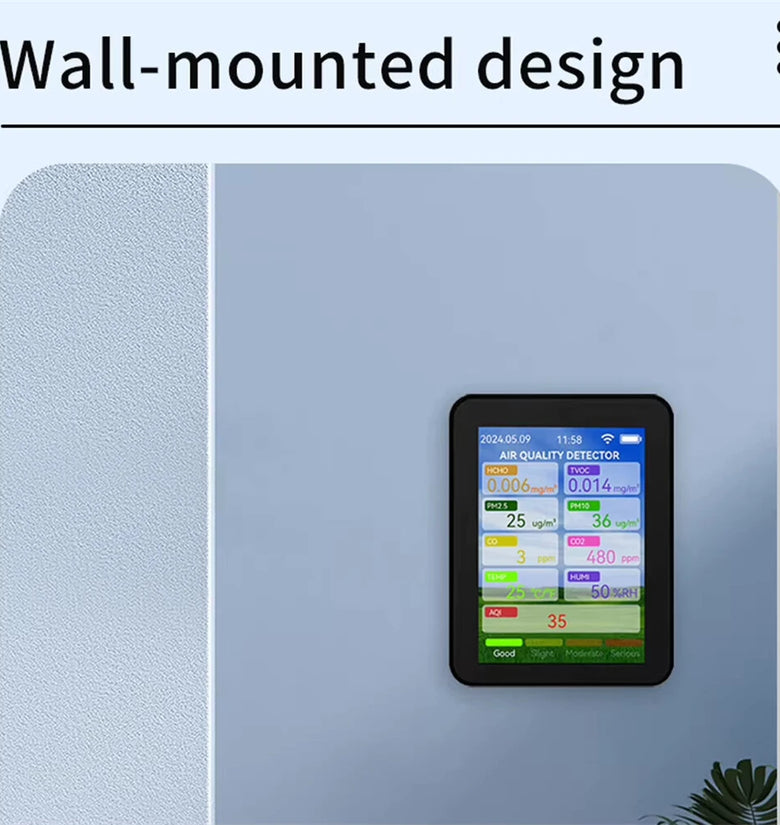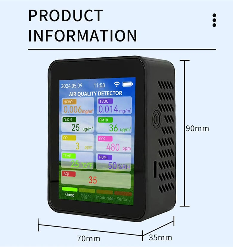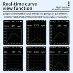 2.Multi-Functional Air Monitoring: Tracks eight critical air parameters, including formaldehyde, volatile organic compounds, PM2.5, PM10, carbon monoxide, carbon dioxide, temperature, and humidity for comprehensive air quality insights.