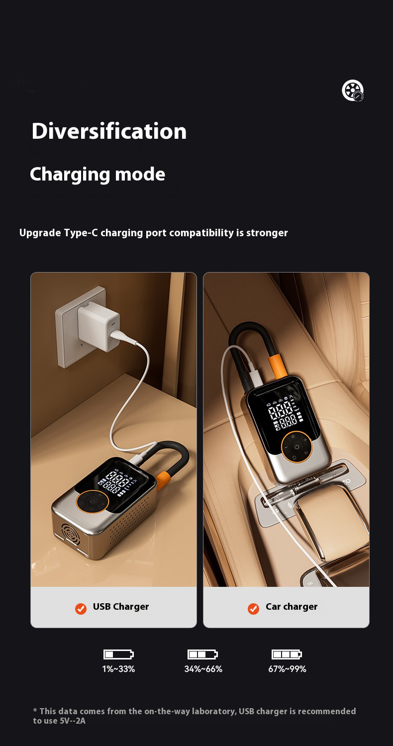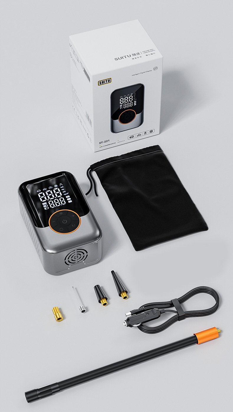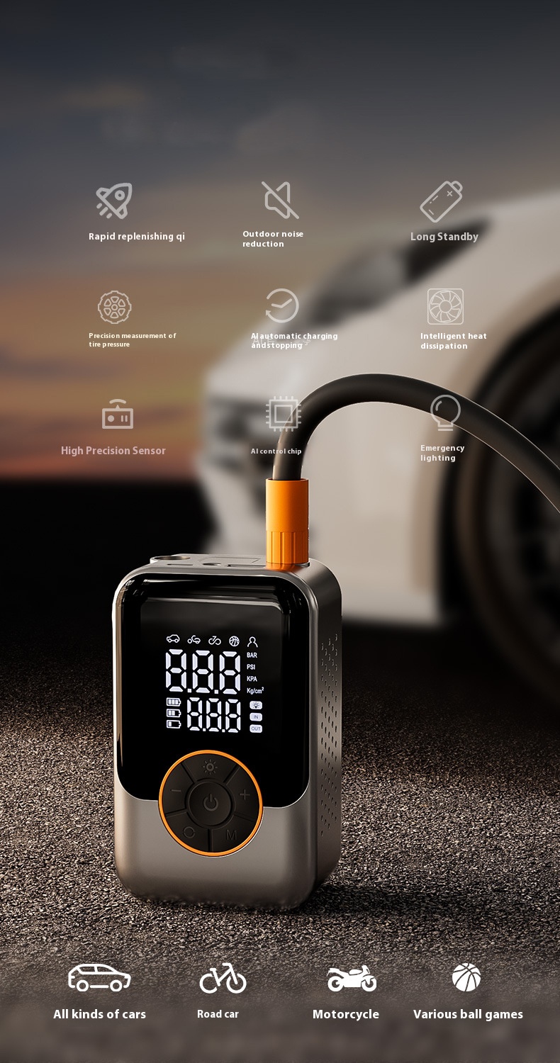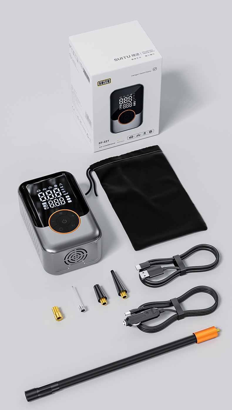 Pairing up with a 4-piece nozzle set, the pump can cater to a variety of needs: vehicle tires, bicycles, sports equipment, and inflatable toys. Compatible with USB and DC charging options for added flexibility.