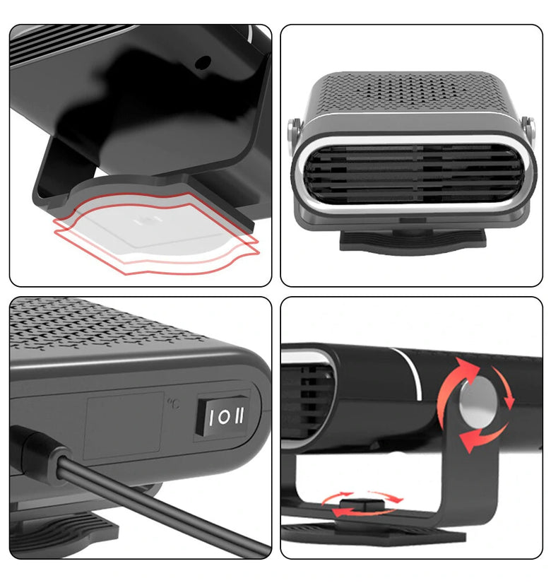 Automobile 12 volt heater comes with a 360 degree rotary holder designed for free adjustment. You can adjust the heater to let the warm air blow where you want it.Put it on the non-slip mat or fix it with double-sided tape.