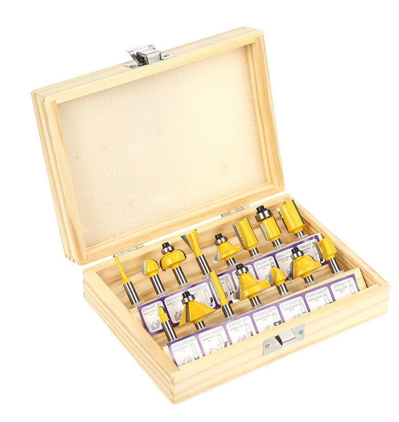 1 x 3mm Straight bit 1 x 6mm Straight Bit 1 x 12mm Straight Bit 1 x 16mm Straight Bit 1 x 7mm Flush Trim Bit 1 x r=6.35 Rounding over bit 1 x r=9.5 Rounding over bit 1 x r=3.17 Core box bit 1 x r=6.35 Cove bit 1 x r=4 Roman Ogee Bit 1 x 12.7mm Dovetail bit 1 x 12mm 90°V Grooving Bit 1 x 45° Chamfer bit |