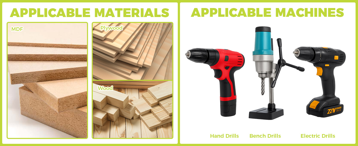 The set is compatible with hand drills, bench drills, and electric drills, catering to various tasks like cabinetry building, furniture making, and general carpentry.