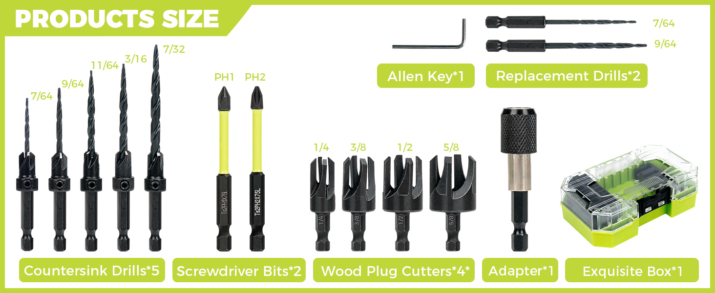 Includes countersink drills, wood plug cutters, screwdriver bits, and essential tools, ensuring you have everything you need for your complete woodworking project in one box.