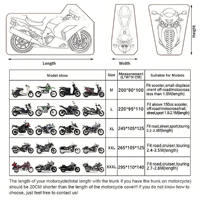 -- Provides full coverage and protection for your motorcycle against dust, dirt, rain, snow, and UV rays.