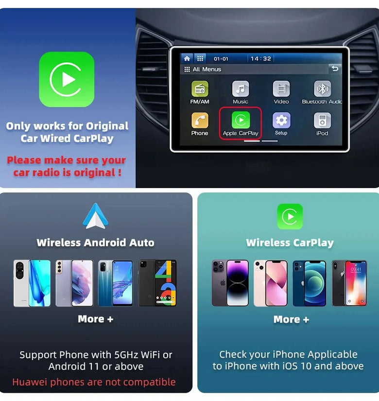 - Easy Transition from Wired to Wireless CarPlay: Effortlessly convert your existing wired CarPlay setup to wireless with our simple USB plug-and-play installation. No need to disassemble your car's OEM radio, making it a hassle-free upgrade.