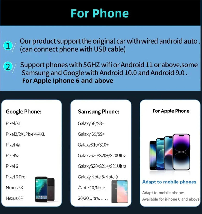 • 2 in 1 Wireless CarPlay Adapter Android Auto Bluetooth 5.0 Dual Band WiFi USB Connection Auto Connect OTA Update Plug and Play
