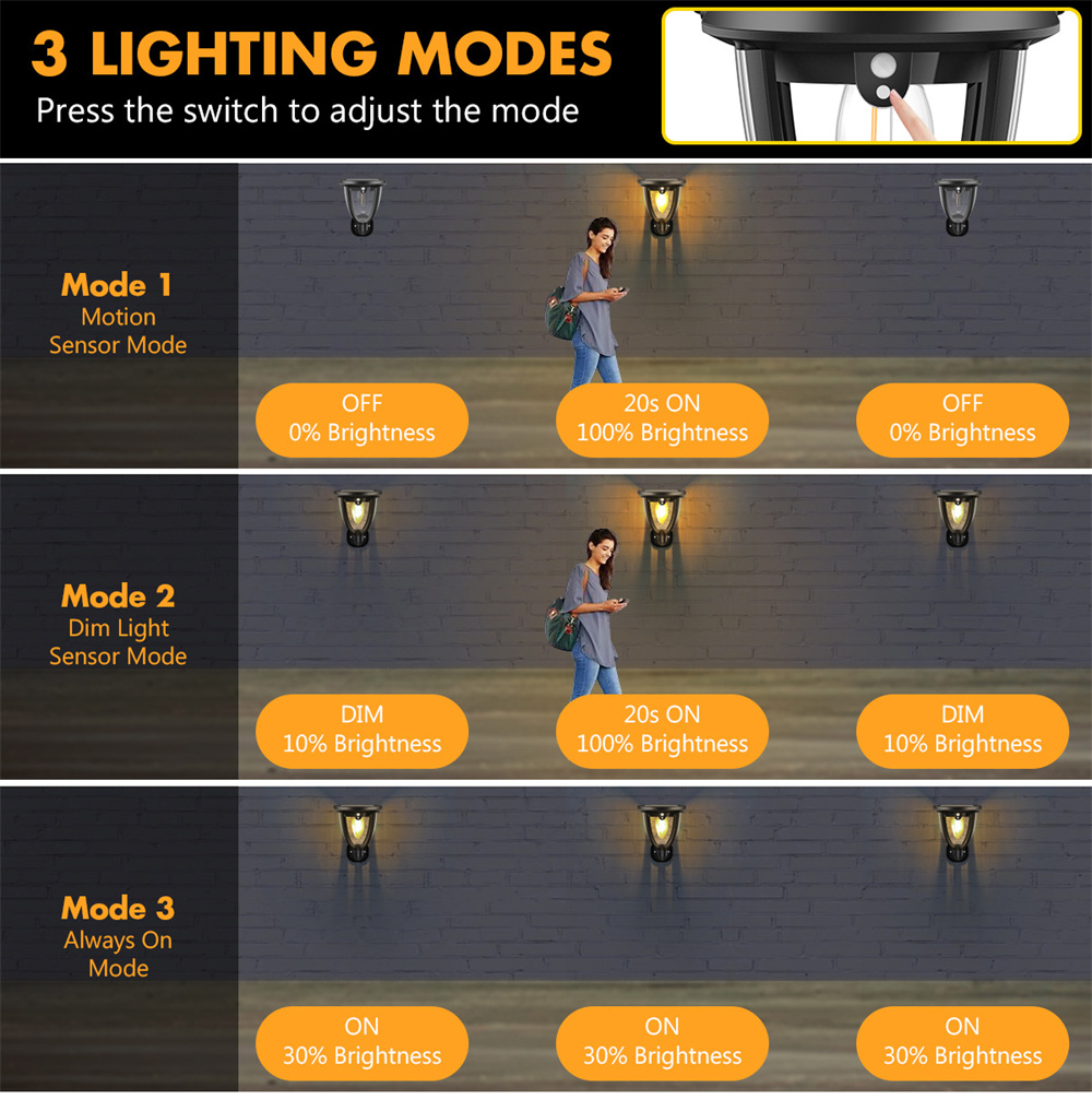 - 3 Lighting Modes: Choose from ① Motion-Activated Bright Light (Dim After Delay) ② Motion + Dim Mode ③ 30% Constant Glow for different needs.