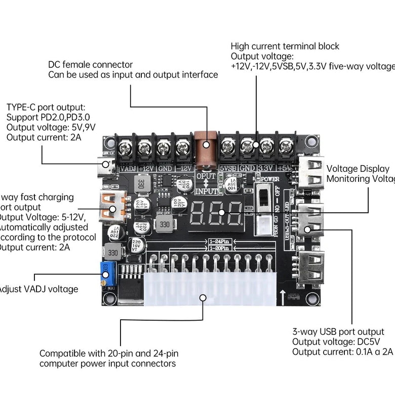 1. The module board is compatible with all 20Pin and 24Pin ATX computer power supplies;