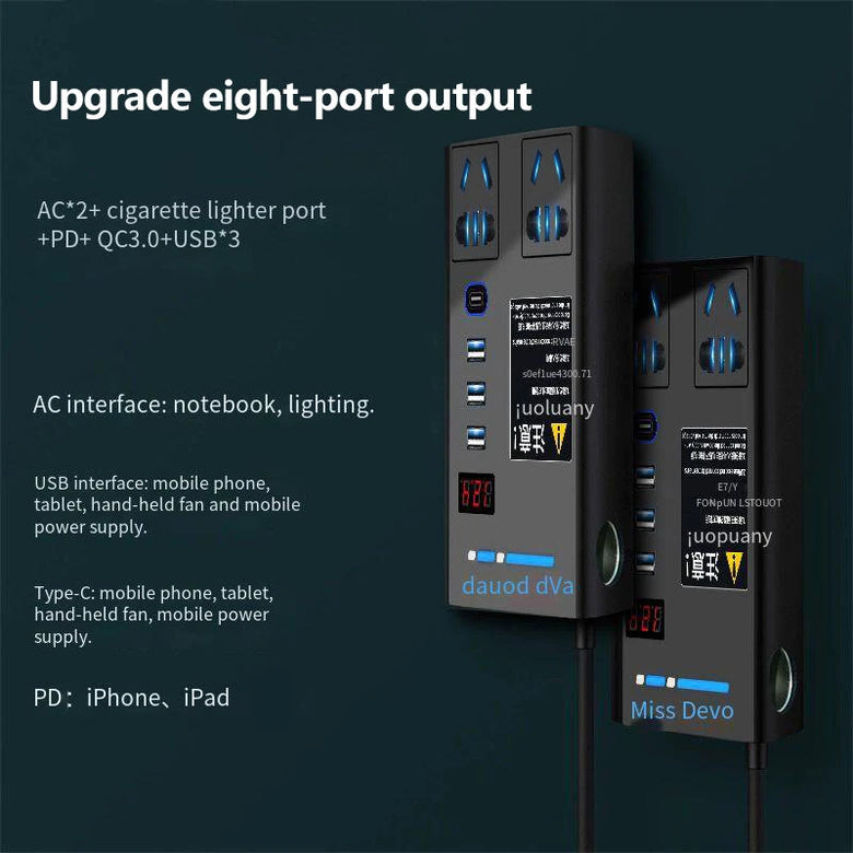 --Upgraded eight output ports, full functions: This charger supports dual sockets, three USB ports, QC3.0, PD, and a cigar lighter expansion port output. With these various output options, users can connect and charge different devices such as notebooks, tablets, mobile phones, car refrigerators, and car vacuum cleaners.
