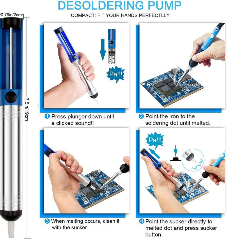 3. Solder Sucker Desoldering Pump: Rugged metal construction,the desoldering pump is high pressure vacuum tube with aluminum body frame, which allows easy one-handed use, best for removing solder from PCB through hole solder joints.