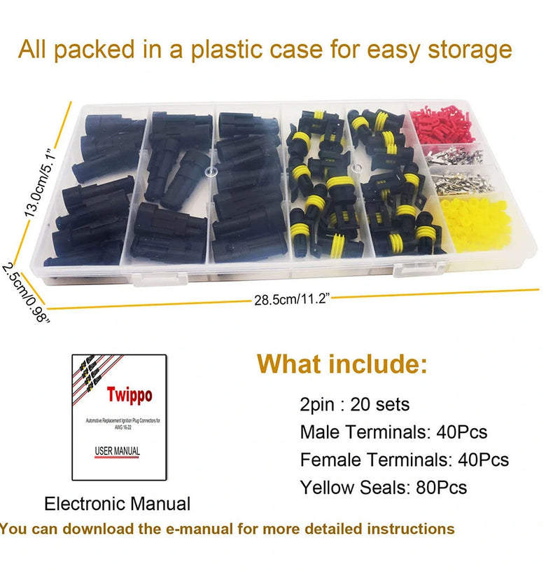 【Package Content and Electronic Manual】20 Kits waterproof electrical connectors 2 pin with male & female terminal and silicone rubber cable seal, 2 pin waterproof connectors: a total of 20 sets of automotive connectors waterproof are included, Ideal for 16-22 AWG wires. Please download the operating instructions first before use.