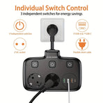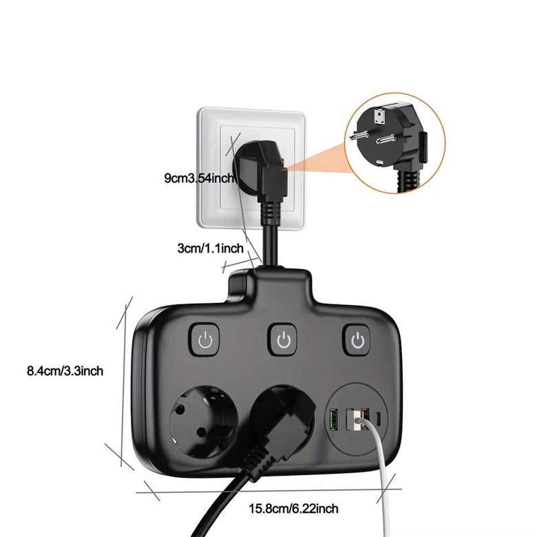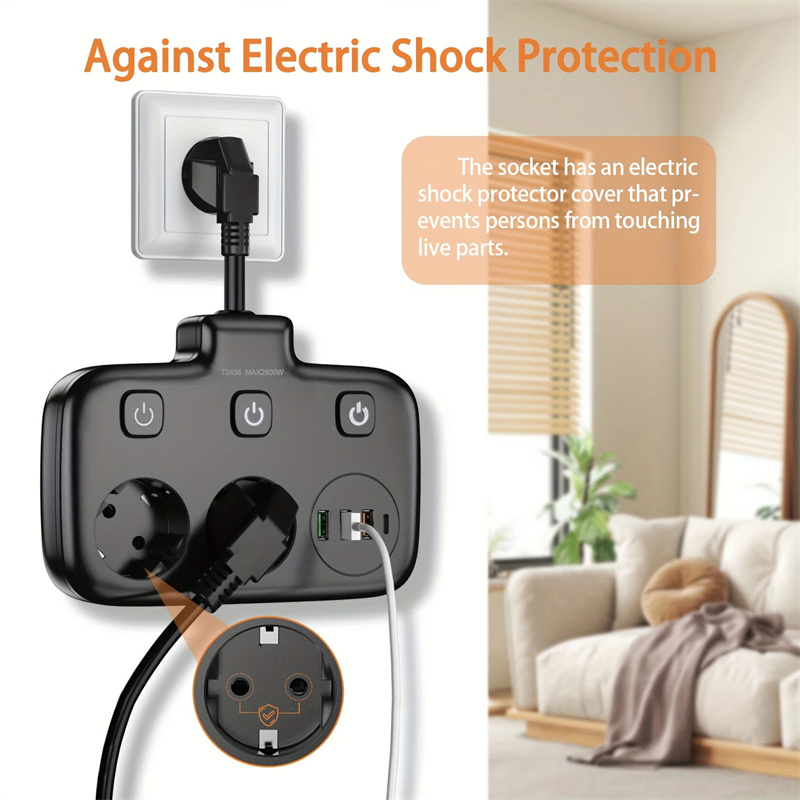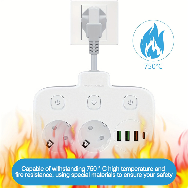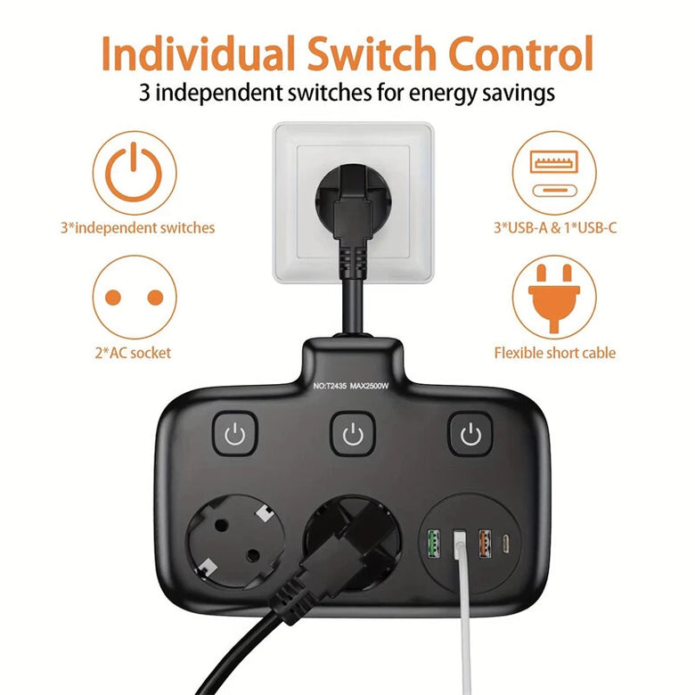 • 2500W 10A EU Plug Power Strip with 2AC+3USB-A+USB-C Fast Charger Multitap Electrical Wall Socket Extension Cord with On/Off Switch