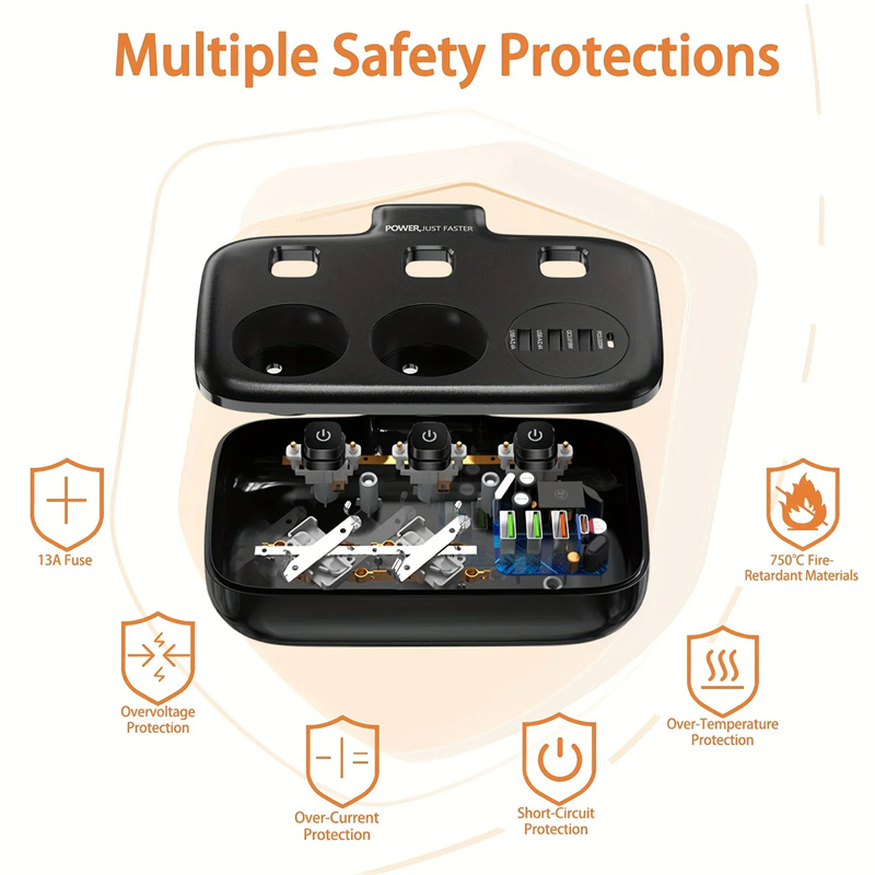 Ports: 2 AC sockets, 3 USB-A ports, 1 USB-C fast charger