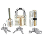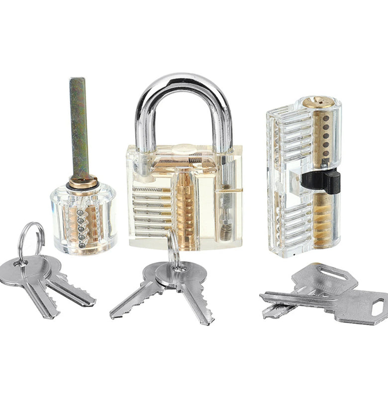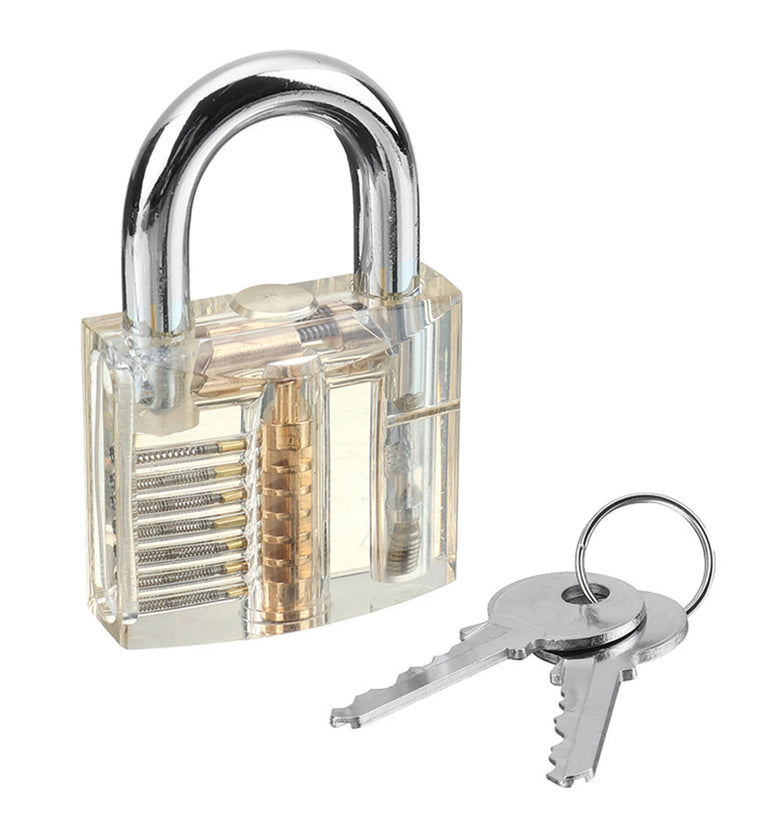 3 Transparent Padlocks- Professional padlock for locksmith practice. save more ~- Lock with open chambers on all the moving parts that allow you to see how it work.- You can see clearly that how the pins work when a key is inserted.- You actually can see the pins moving up and down as the key slides into and out of the lock.- In perfect smooth working condition with no loose parts or pins will come out.18 Tableting Tools- Material: Spring Steel- Thickness: 0.18mm- Padlock shims are formed pieces of thin yet stiff metal designed to take advantage of mechanical imperfections and tolerances in the latching design of some popular brands/models of locks- An easy way to open many padlocks is to utilize Padlock Shims. It made of very thin spring steel to fit the contour of the hasp of the lock- Just push one down between the hasp and the body of the lock and twist to disengage the locking mechanismPackage Included:3 x Transparent Padlocks3 x Keys18 x Miscellaneous Lock Picks1 x Zippered Case1 x ClampDetail Pictures: