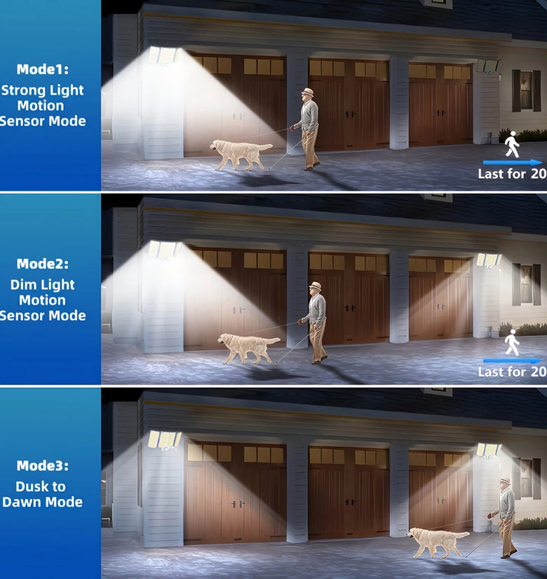 - Three Lighting Modes: Tailored to meet diverse needs, the light features three modes: Strong Light Motion Sensor Mode, Dim Light Motion Sensor Mode, and DusktoDawn Mode. These intelligent settings ensure energy conservation while providing efficient lighting based on surrounding activity and time of day.