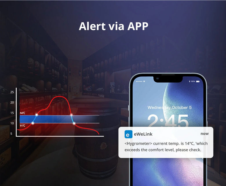 You’ll receive instant alerts from your phone when the temperature or humidity exceeds your set comfort level.