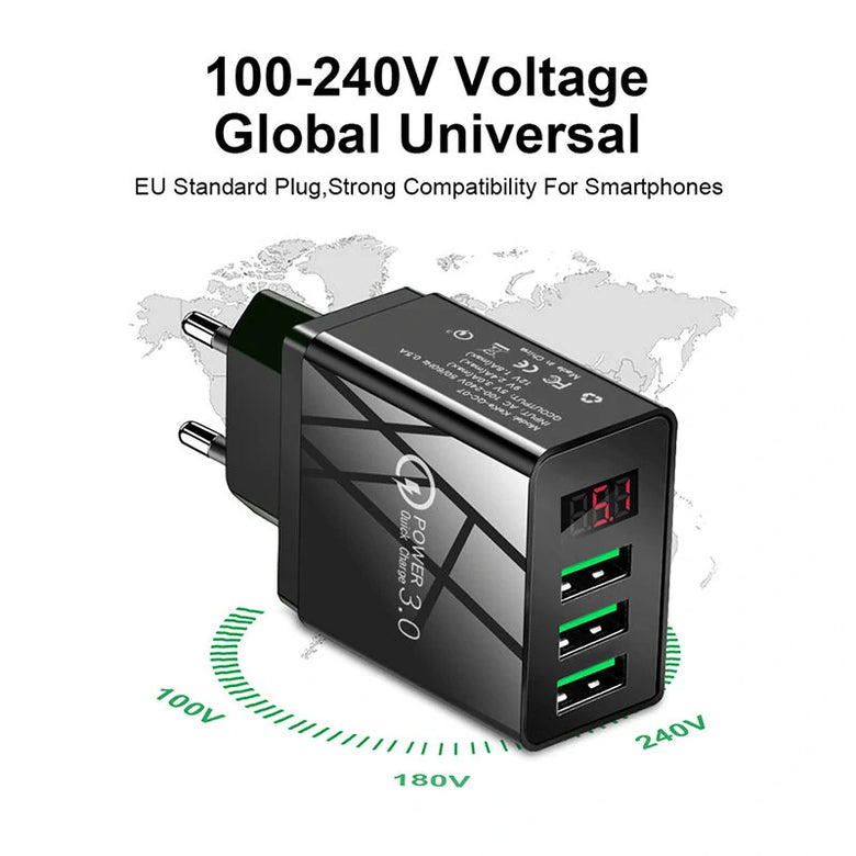 • 3.1A 3-Port USB Charger Digital Display Fast Charging Wall Charger Adapter EU Plug for iPhone13 14 14 Pro Max for Huawei Mate50 for Xiaomi Mi13 for Samsung Galaxy S22 for Redmi K60
