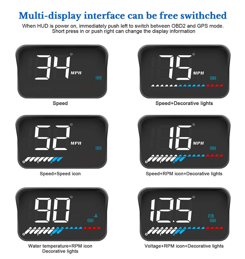 This head-up display supports a wide range of vehicle models with an easy power-on GPS mode selection, ensuring broad compatibility and simple setup for any car type.