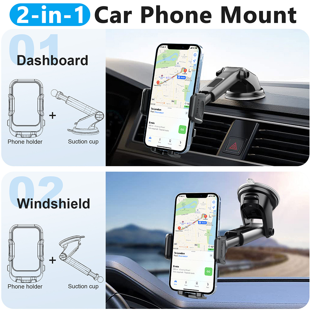 1. Versatile Mounting Options: The holder can securely attach to either your car's windshield or dashboard, providing flexible installation choices to suit your preferences and convenience.
