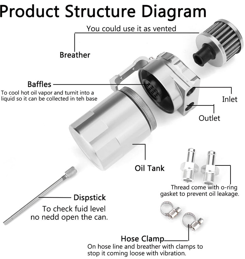 Oil Catch tank can capture the oil and moisture in the leaking air, which will cause carbon and sludge in the intake system and engine. The same is true for direct injection engines. The trapping tank will remove the oil vapor discharged from turbocharged and non-turbocharged engines, so as not to damage your car's performance. They can keep the engine clean even in difficult driving conditions.