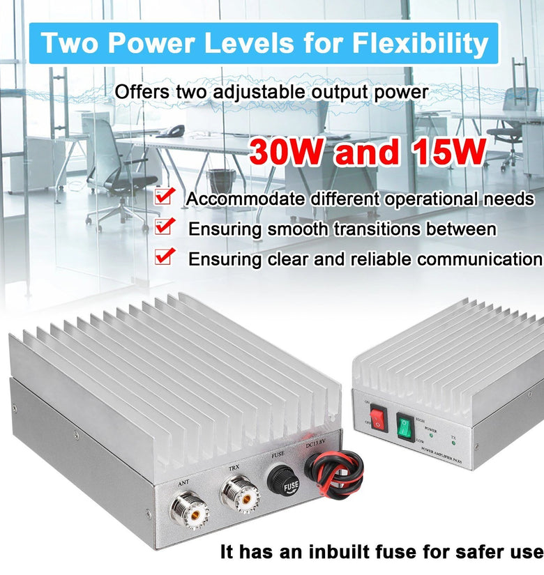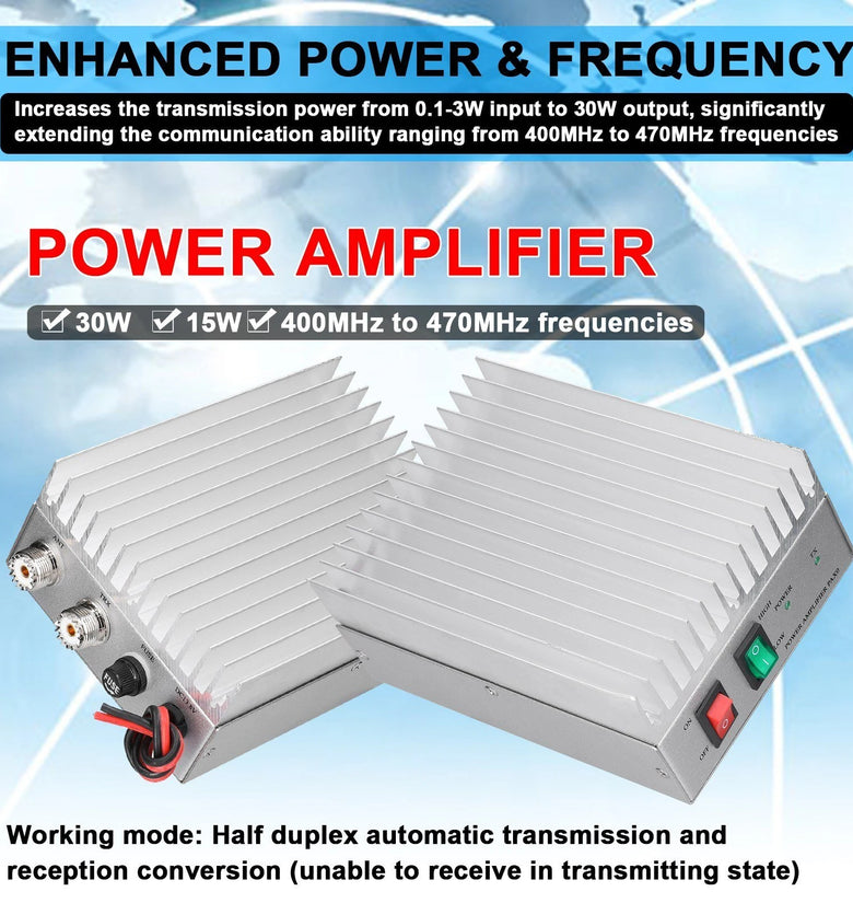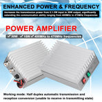 Enhanced Power & Frequency: Boosts transmission from 0.1-3W input to 30W output, extending communication range across 400-470MHz frequencies.