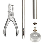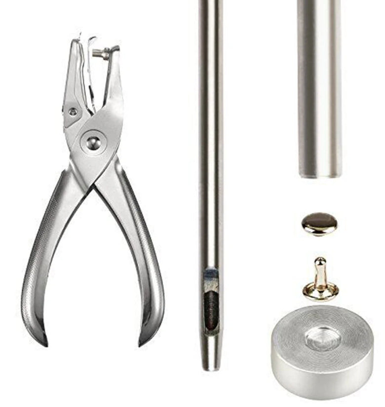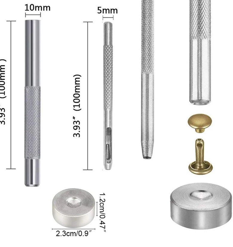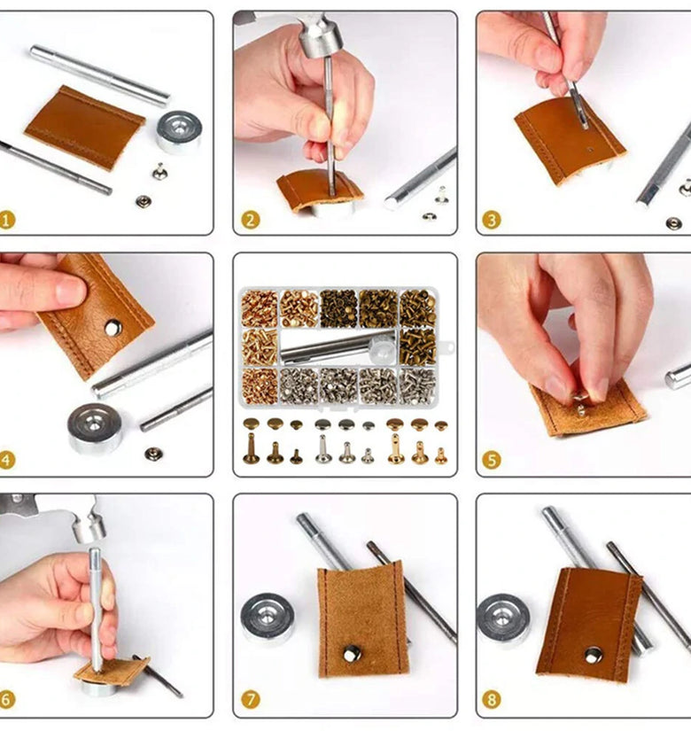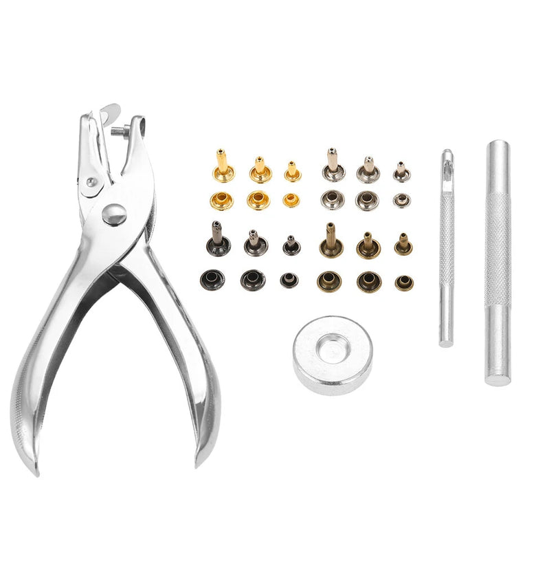 The number of 3 specifications includes the quantity:30 x Gold leather studs30 x Silver leather studs30 x Green bronze leather studs30 x Gun black leather rivets1 x Double-sided base1 x Perforated rod1 x Rivet mounting rod1 x Punch Pliers: For soft leather only.Note: