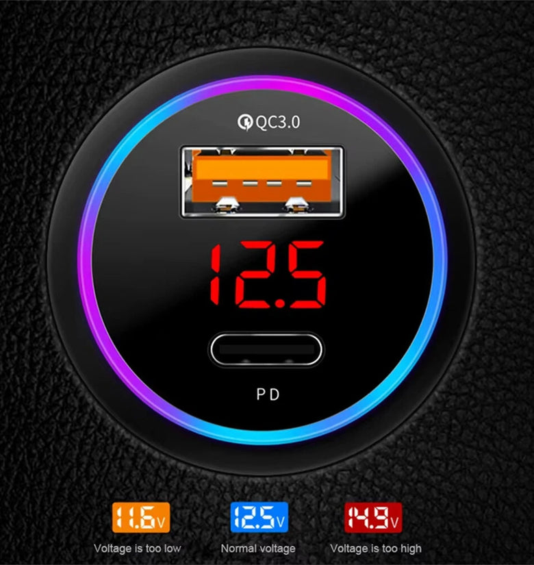 Premium Design: Ultra-compact size. A soft LED light ring illumination to help you easily find the charging ports while driving at night, and a soft LED light screen will display the voltage of your car battery at any time.