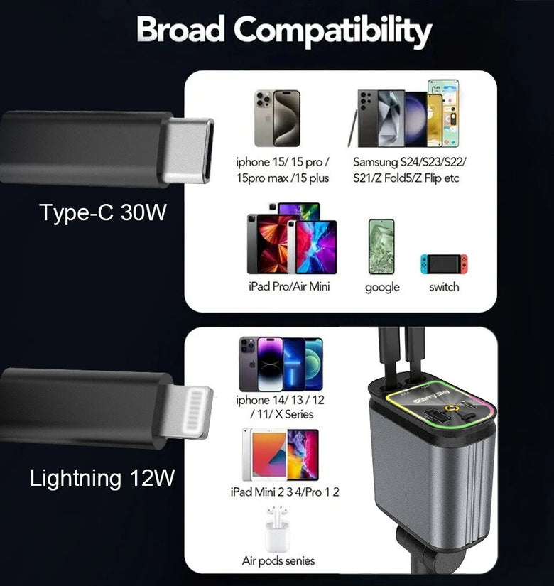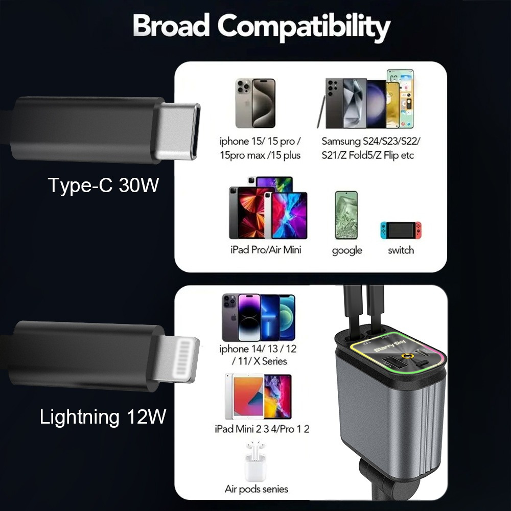 - Dual Port Charging Capability: This car charger comes with both a Type-C and a Lightning port, providing up to 30W and 12W respectively to efficiently charge a variety of devices including iPhones, iPads, for Samsung Galaxy series, Google devices, and more.