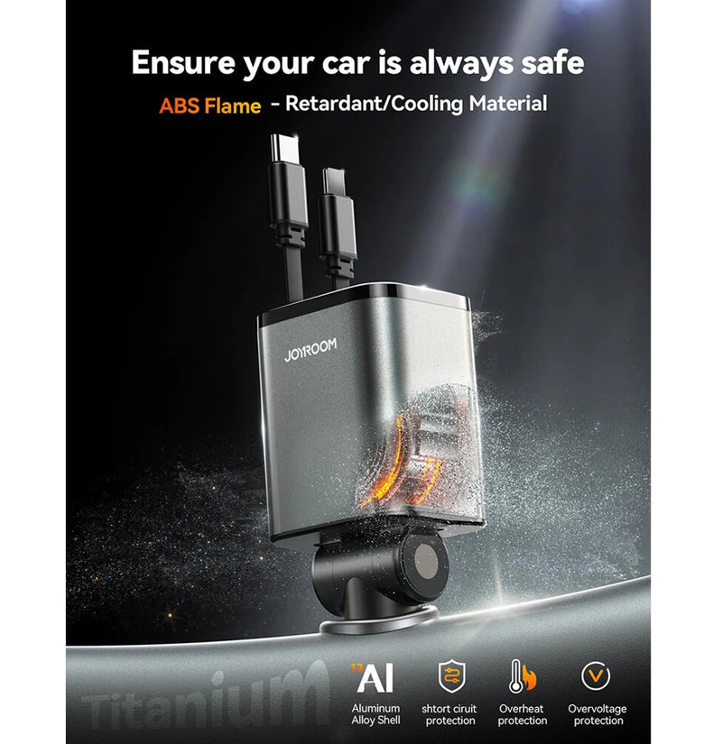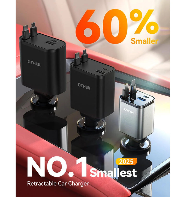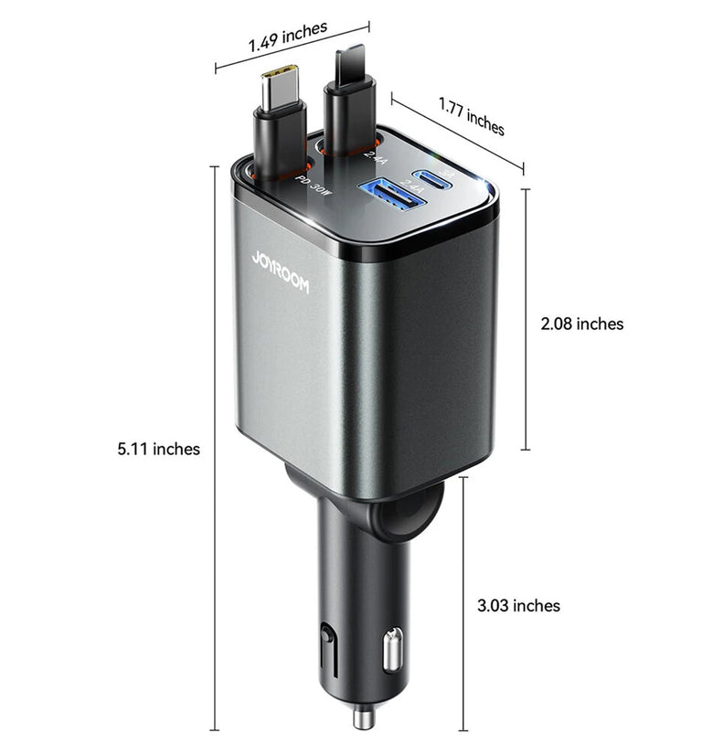 The JOYROOM 2025 retractable car charger boasts the smallest 4-in-1 design that perfectly integrates into compact spaces such as trucks and older cars. Measuring just 5.11 x 1.77 x 1.49 inches, it fits snuggly into the car lighter without obstructing your driving controls, making it an ideal companion for family road trips and tight areas.