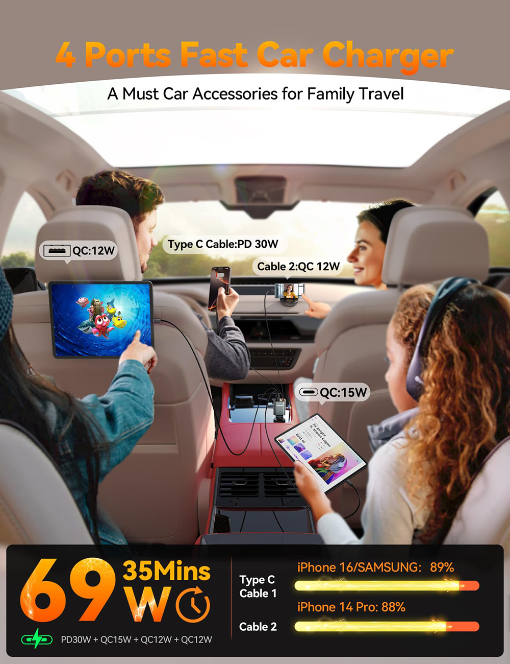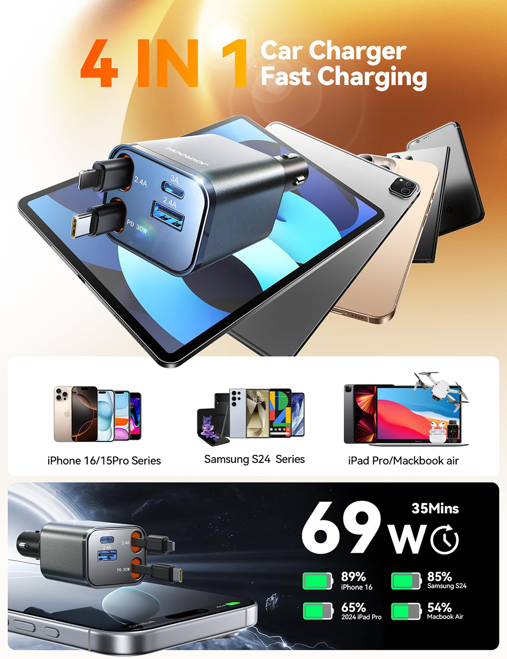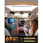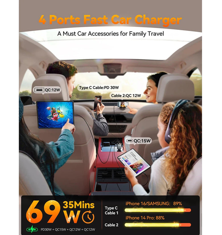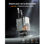 Equipped with four charging options, the car charger efficiently powers up to four devices simultaneously using two retractable cables and two USB ports. The smart power distribution technology ensures all devices receive optimal charging speeds, eliminating the need to prioritize one device over another.