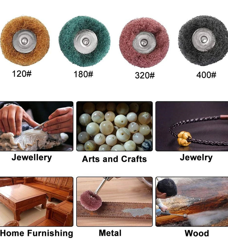 Featuring four grit levels (Brown 120, Green 180, Red 320, Black 400), this polishing wheel set is suitable for tasks ranging from heavy deburring to fine finishing.