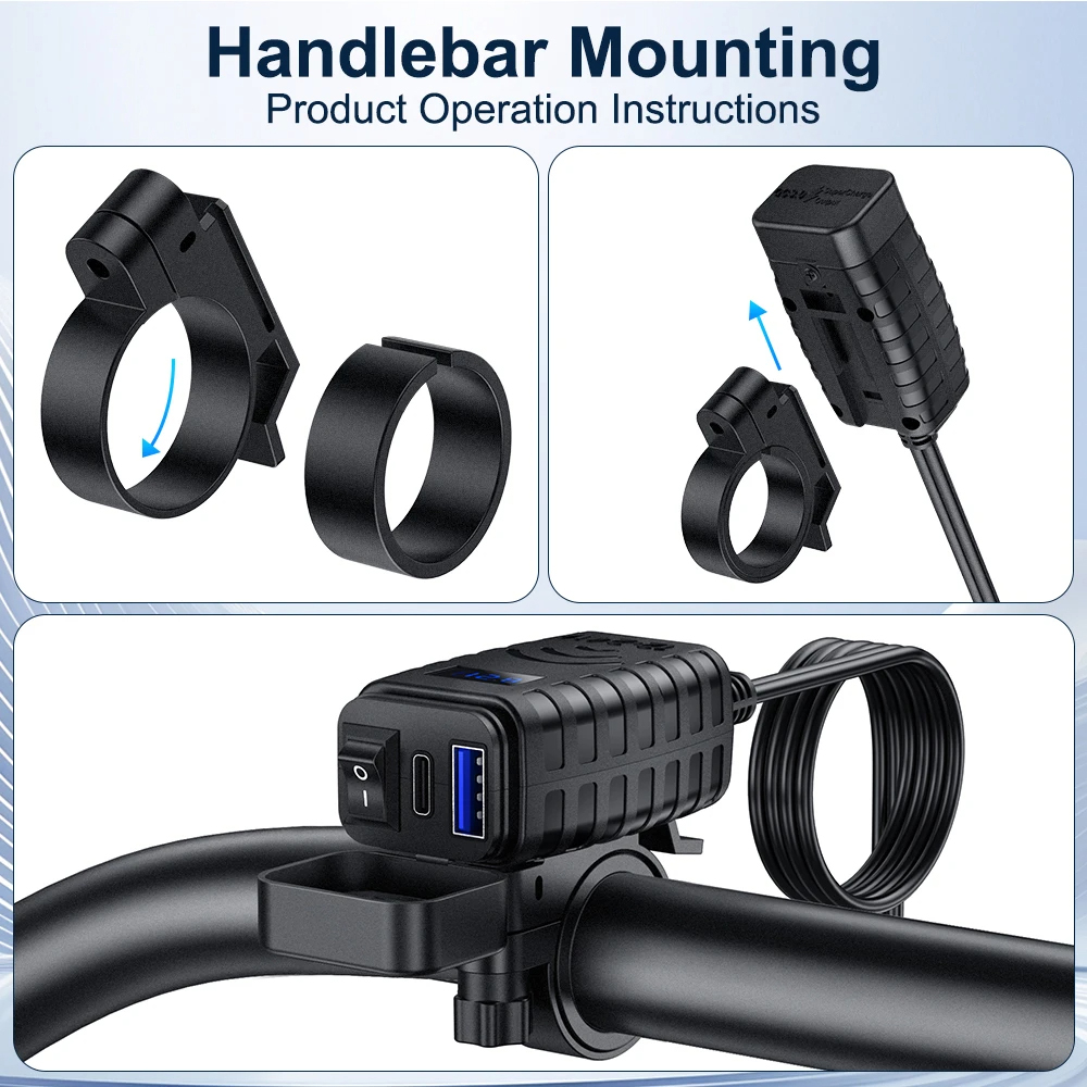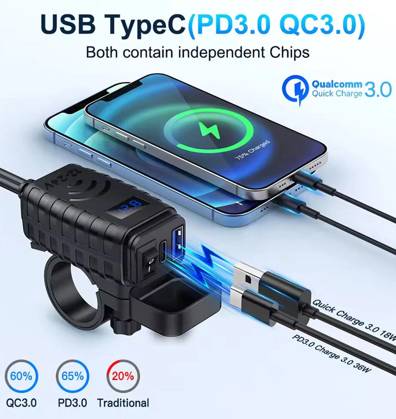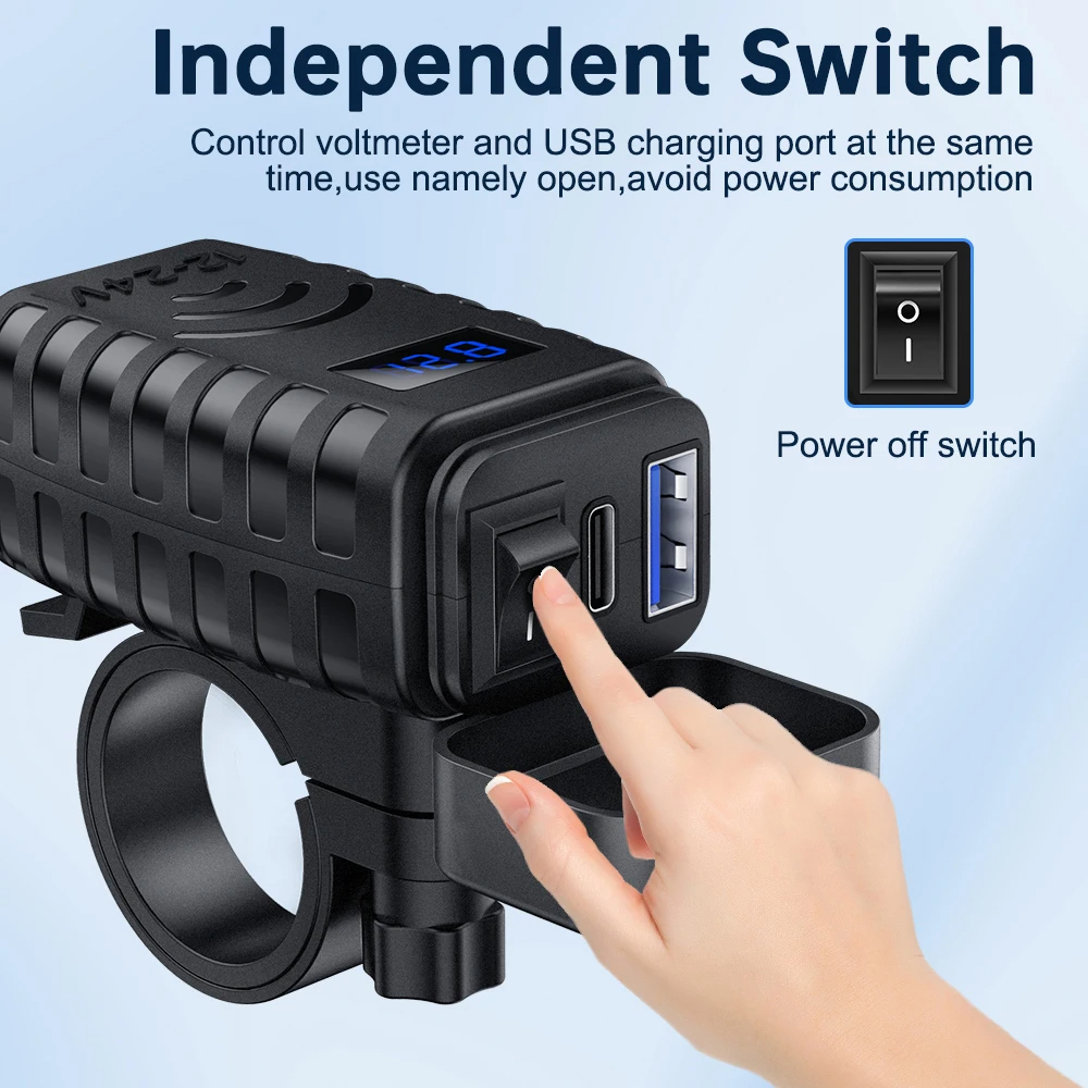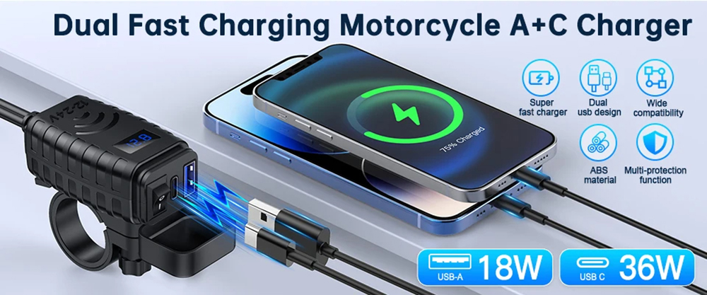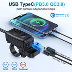 - Efficient Dual-Port Fast Charging: Equipped with a 48W USB-A (Quick Charge 3.0) and USB-C port, this motorcycle charger allows you to power up two devices simultaneously. The advanced fast charging technology ensures your devices are charged quickly, keeping you connected and powered throughout your ride without any delay.