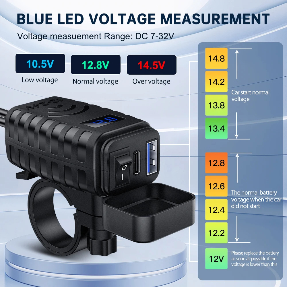 - Integrated LED Voltmeter and Switch: The built-in LED voltmeter and ON/OFF switch provide real-time monitoring of your battery’s health and electrical system status. Easily check the voltage on the screen to ensure your battery is in optimal condition, making your rides safer and more informed.